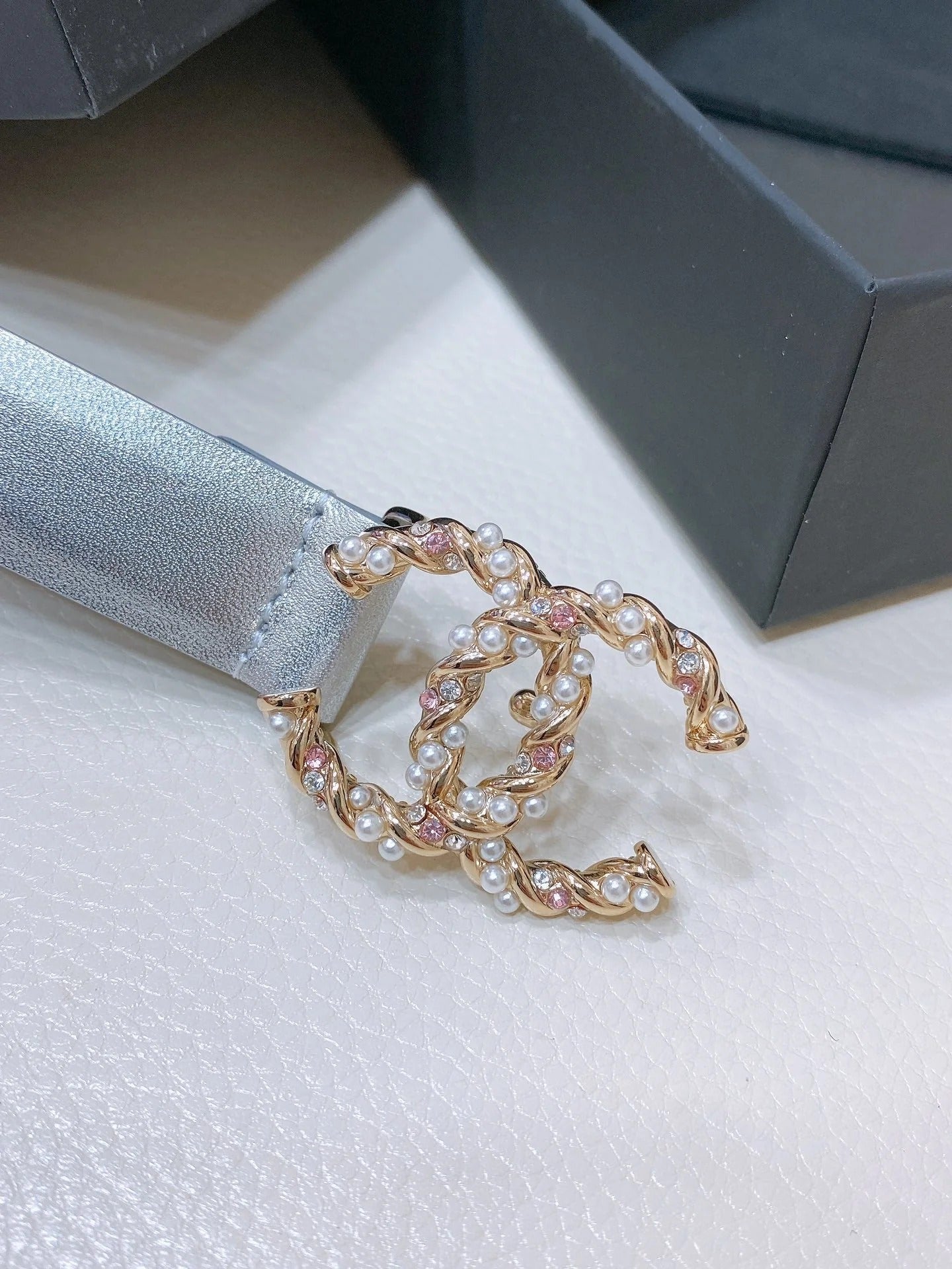 CC BELT 20MM IN SILVER GREY CALFSKIN GOLD HARDWARE ATTACH PEARLS