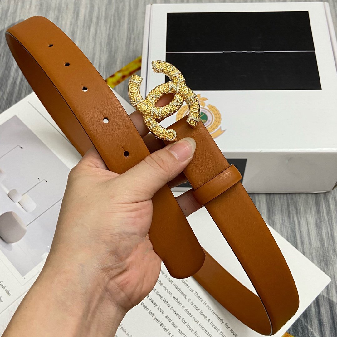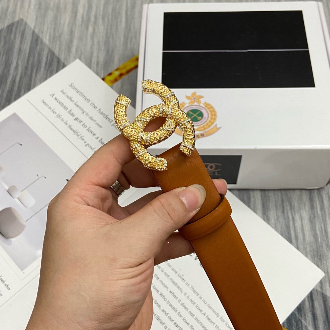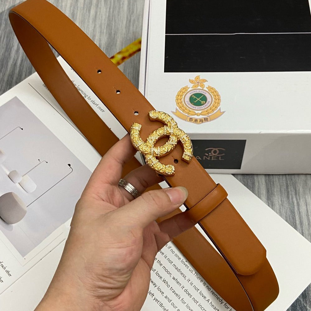 CC BELT 30MM BUCKLE GOLD DIAMOND LEATHER BROWN