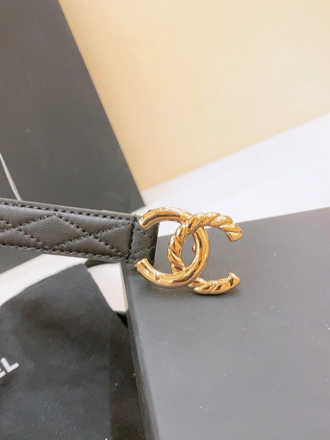 DOUBLE C BELT 20MM IN BLACK CALFSKIN WITH QUILTED STITCHING AND SPIRAL GOLD BUCKLE