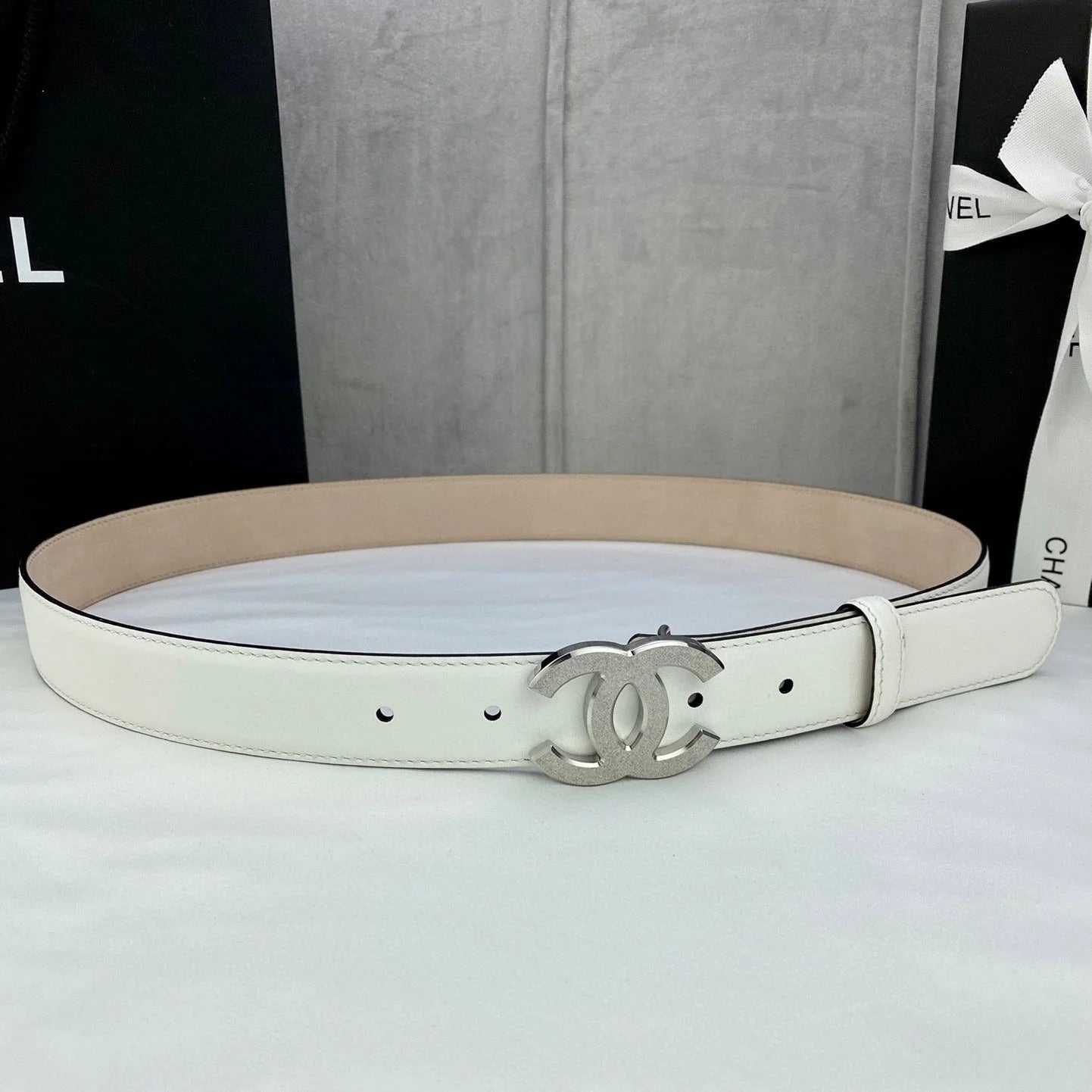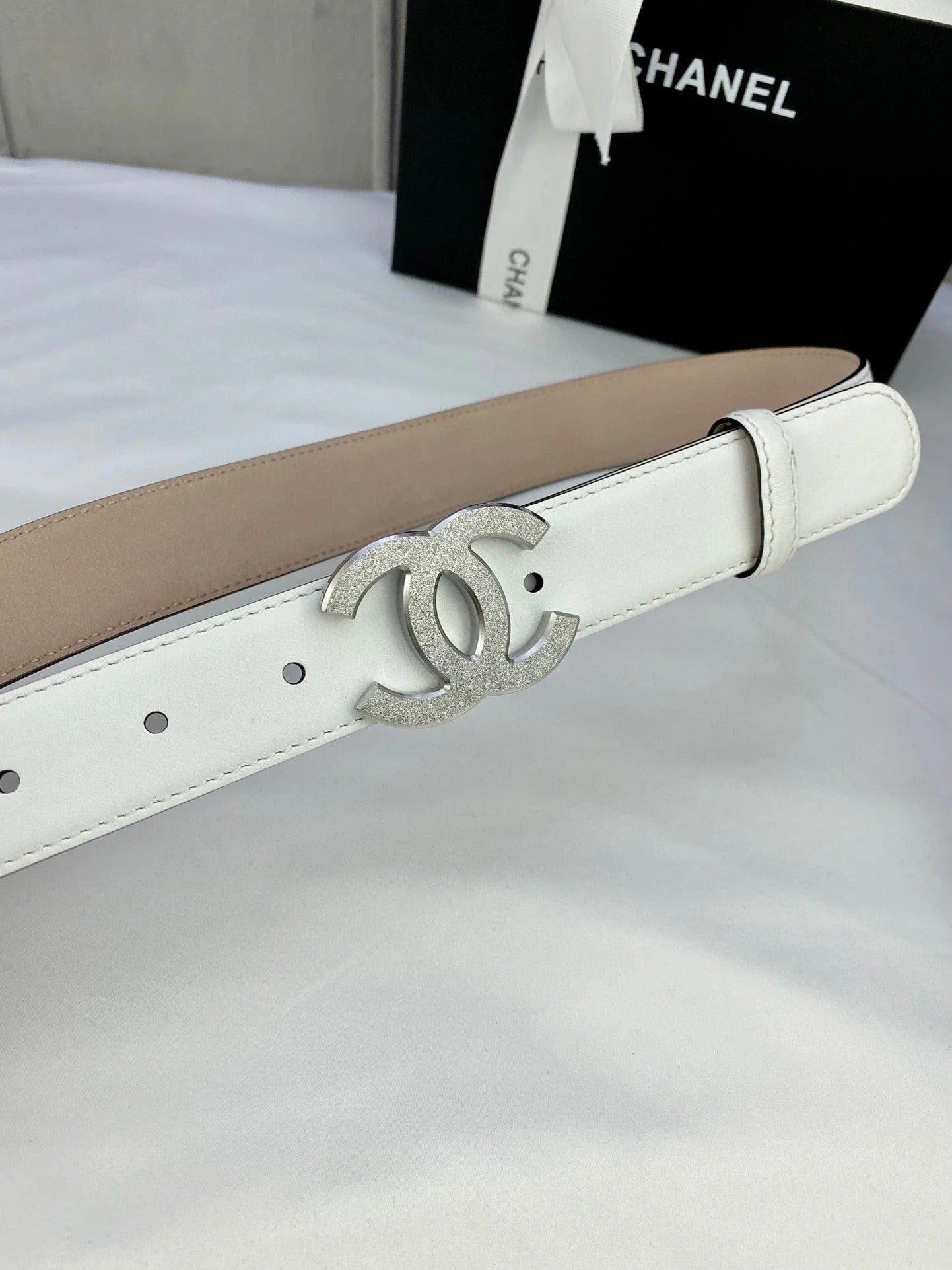 DOUBLE C BELT 30MM IN WHITE CALFSKIN METAL BUCKLE