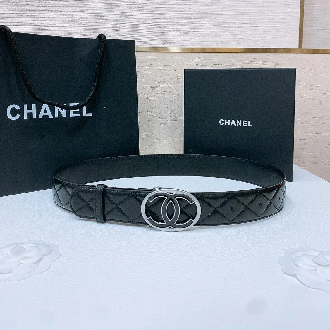DOUBLE C BELT 38MM IN BLACK QUILTED LAMBSKIN SILVER OVAL BUCKLE CENTERED BLACK LOGO