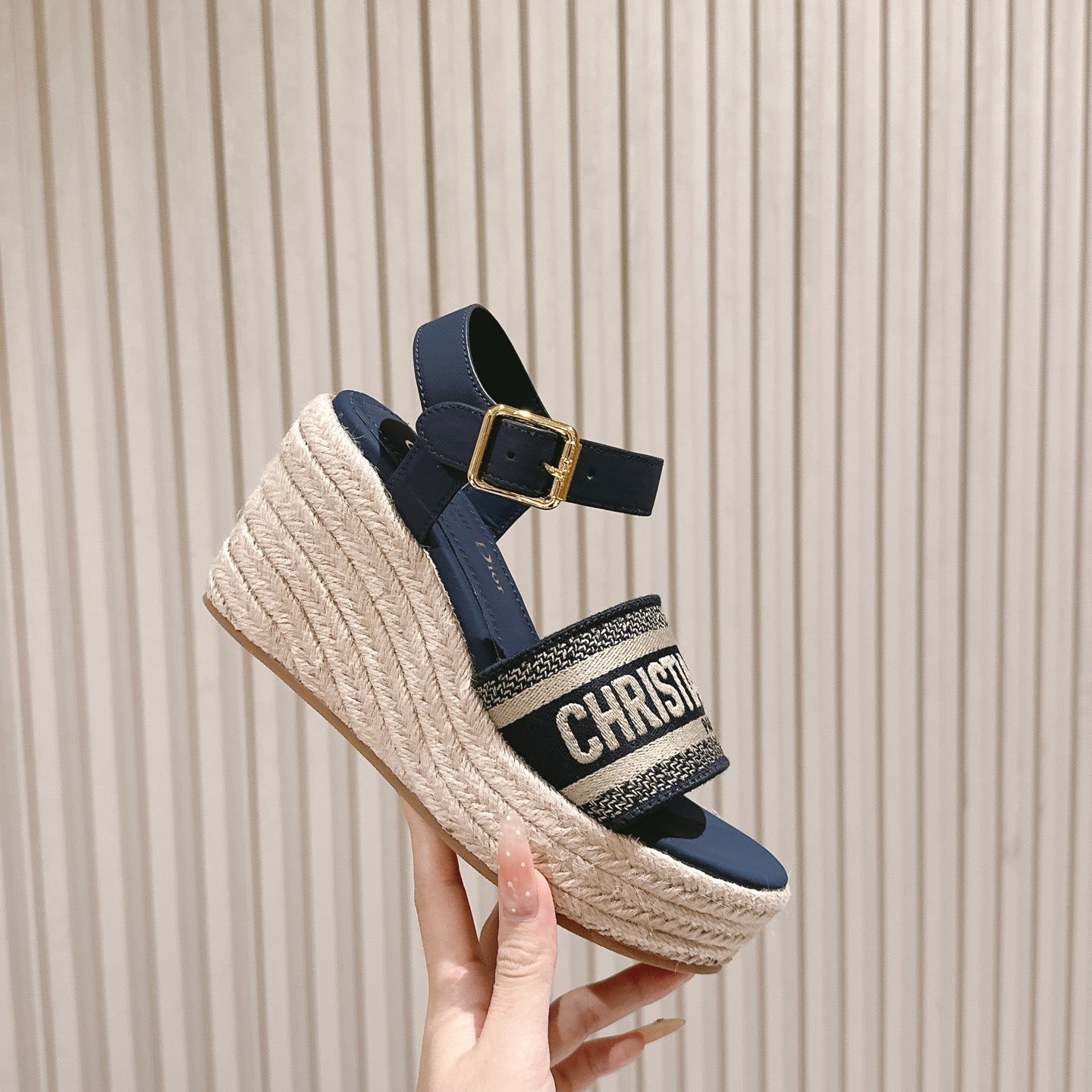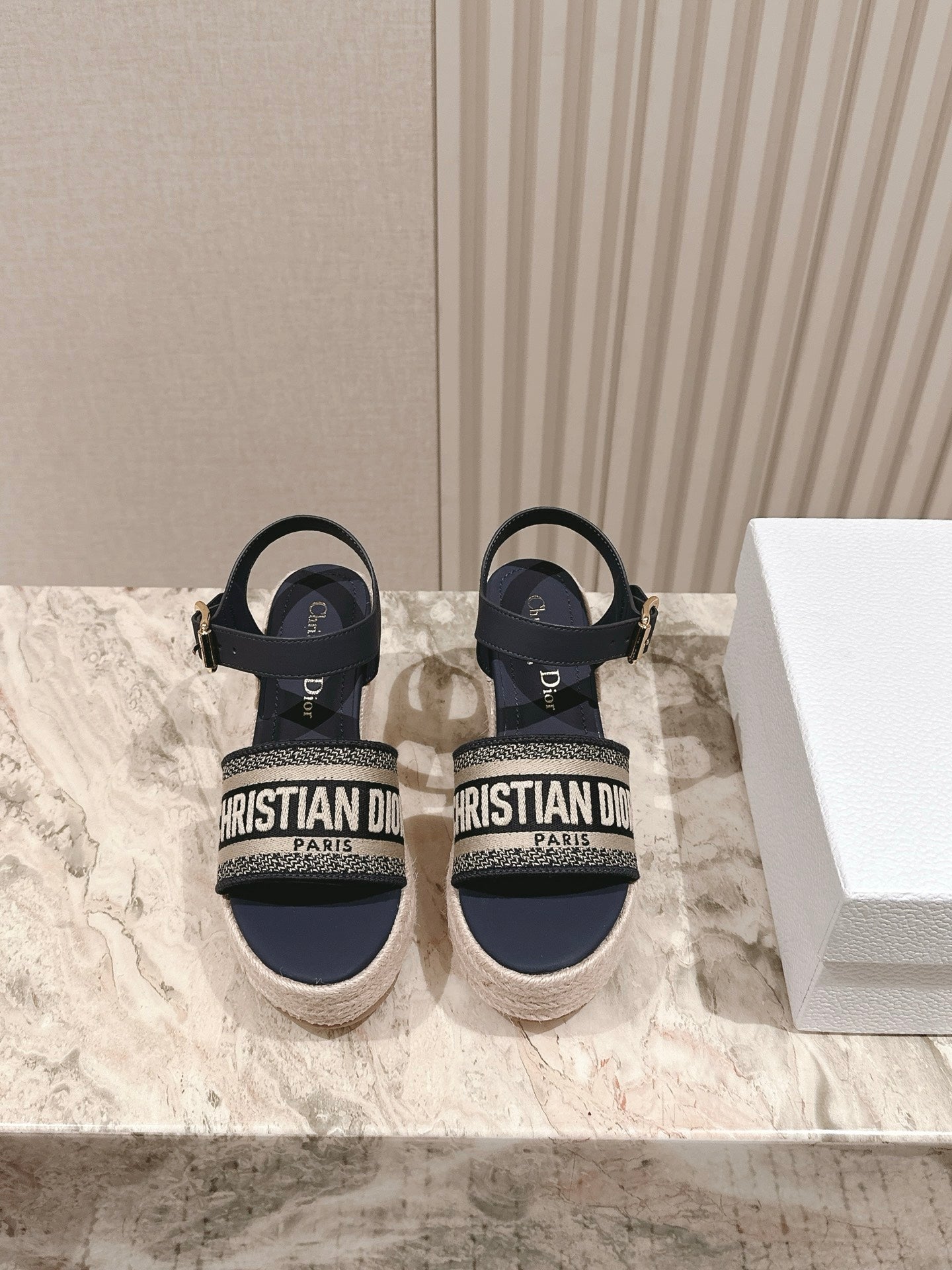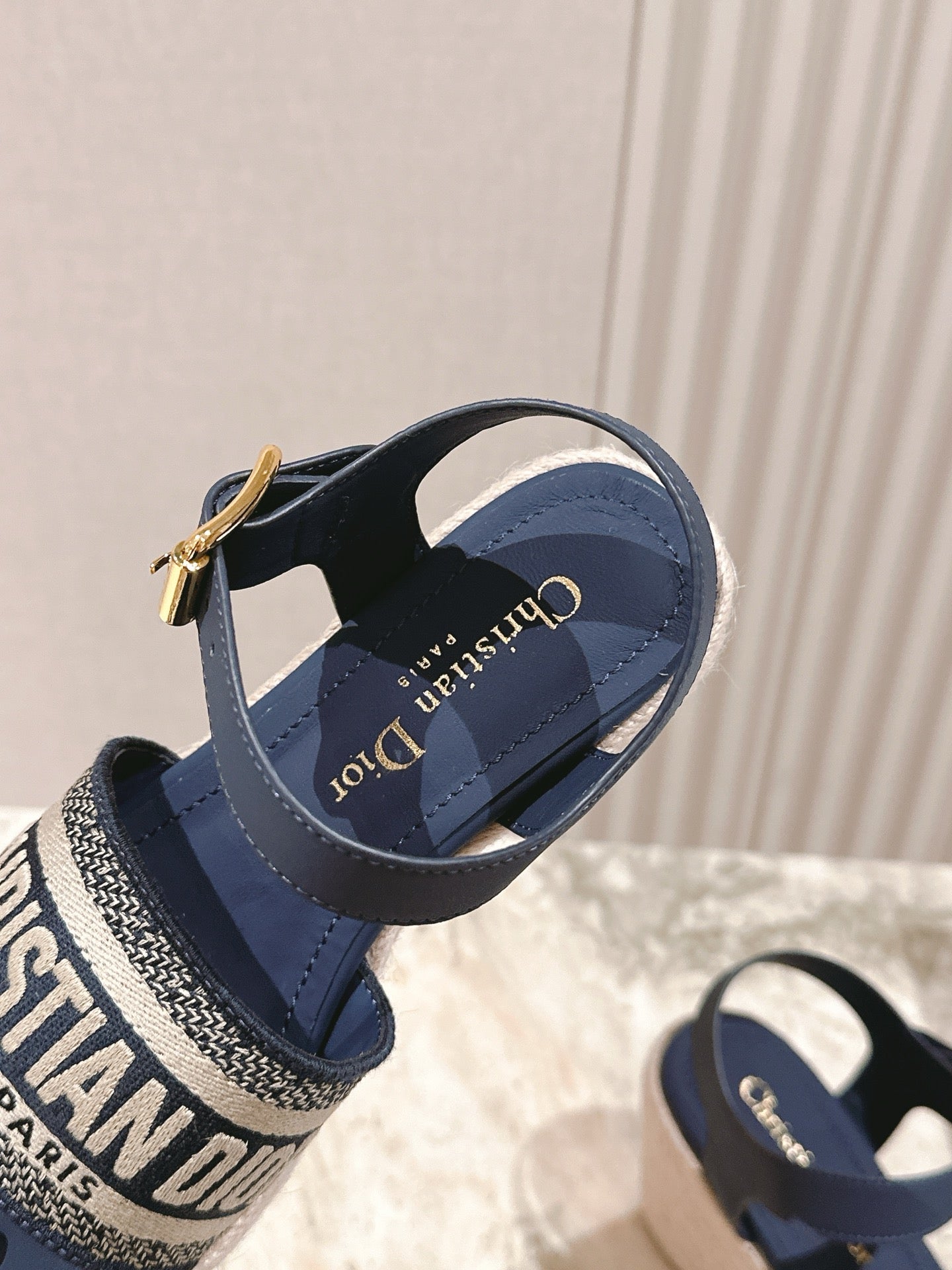 CD Dway Wedge Sandal 85mm Deep Blue Calfskin and Embroidered 483077