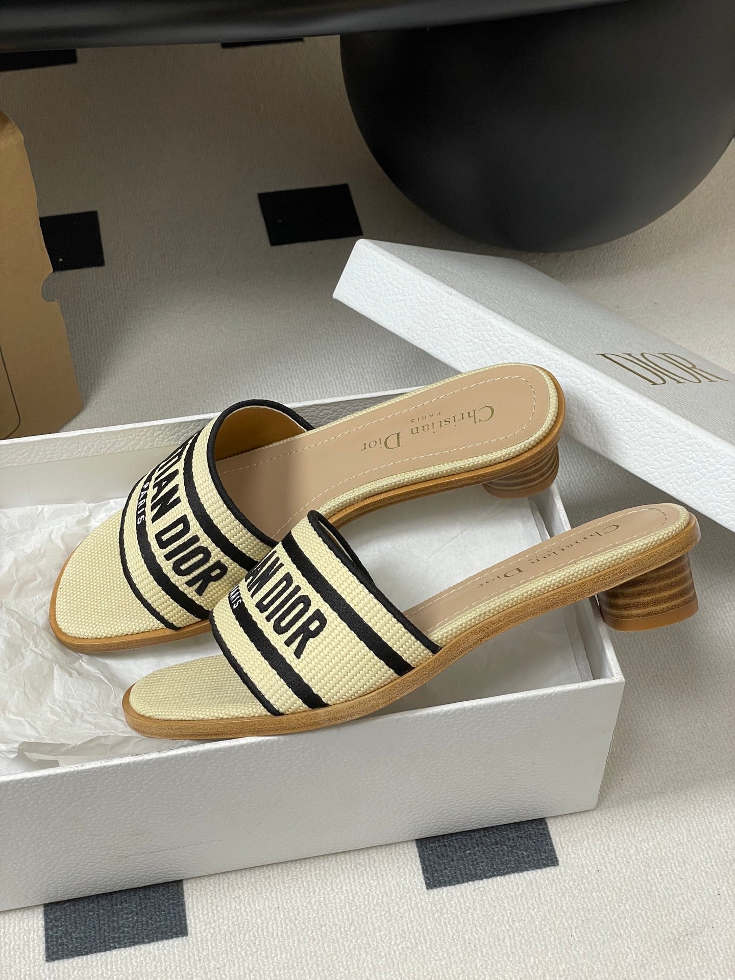 CD Dway Heeled Slide 35mm Natural Raffia and Deep Blue Embroidered Cotton