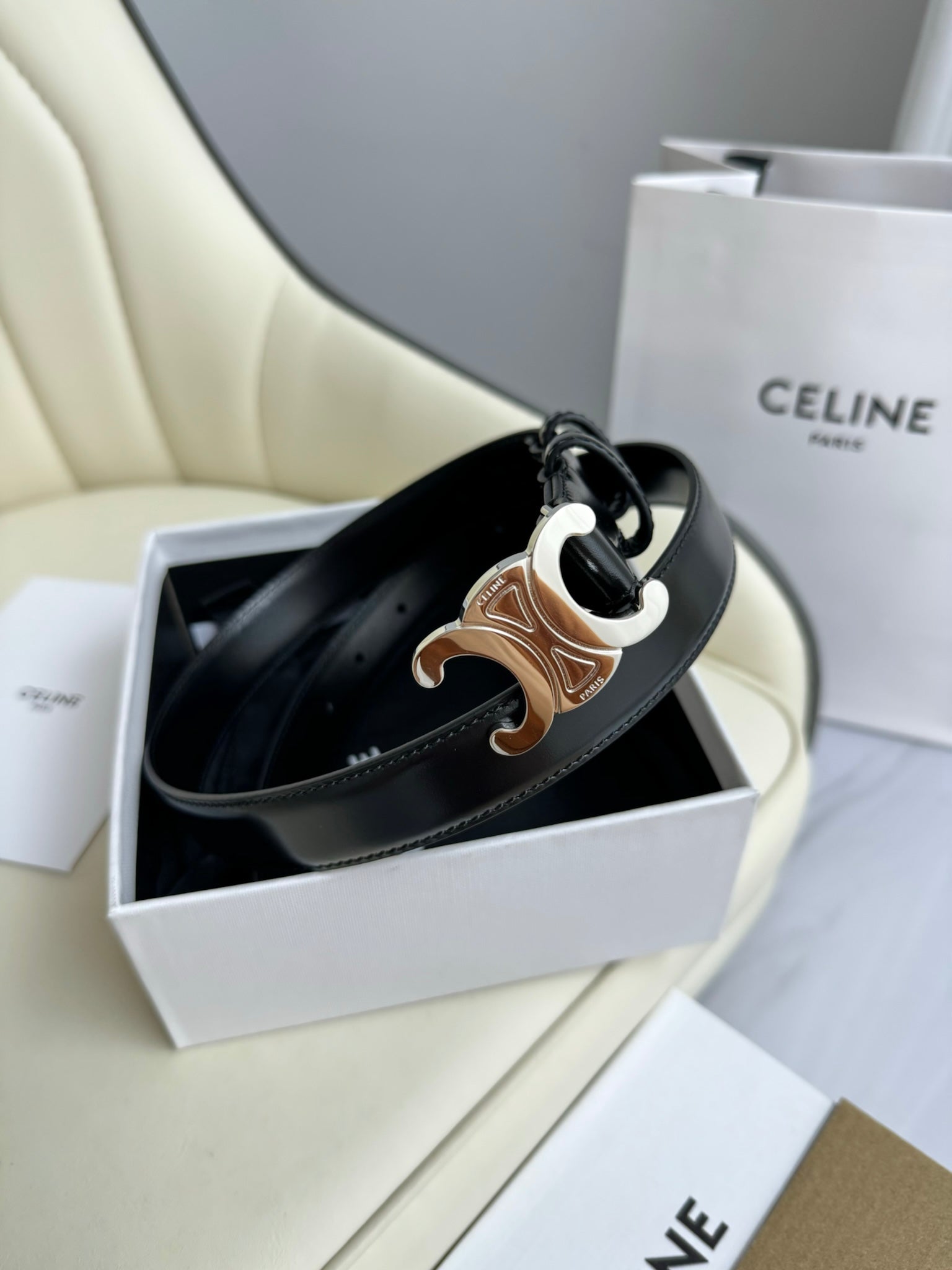 SMALL TRIOMPHE BELT 18 MM BLACK LEATHER SILVER HARDWARE