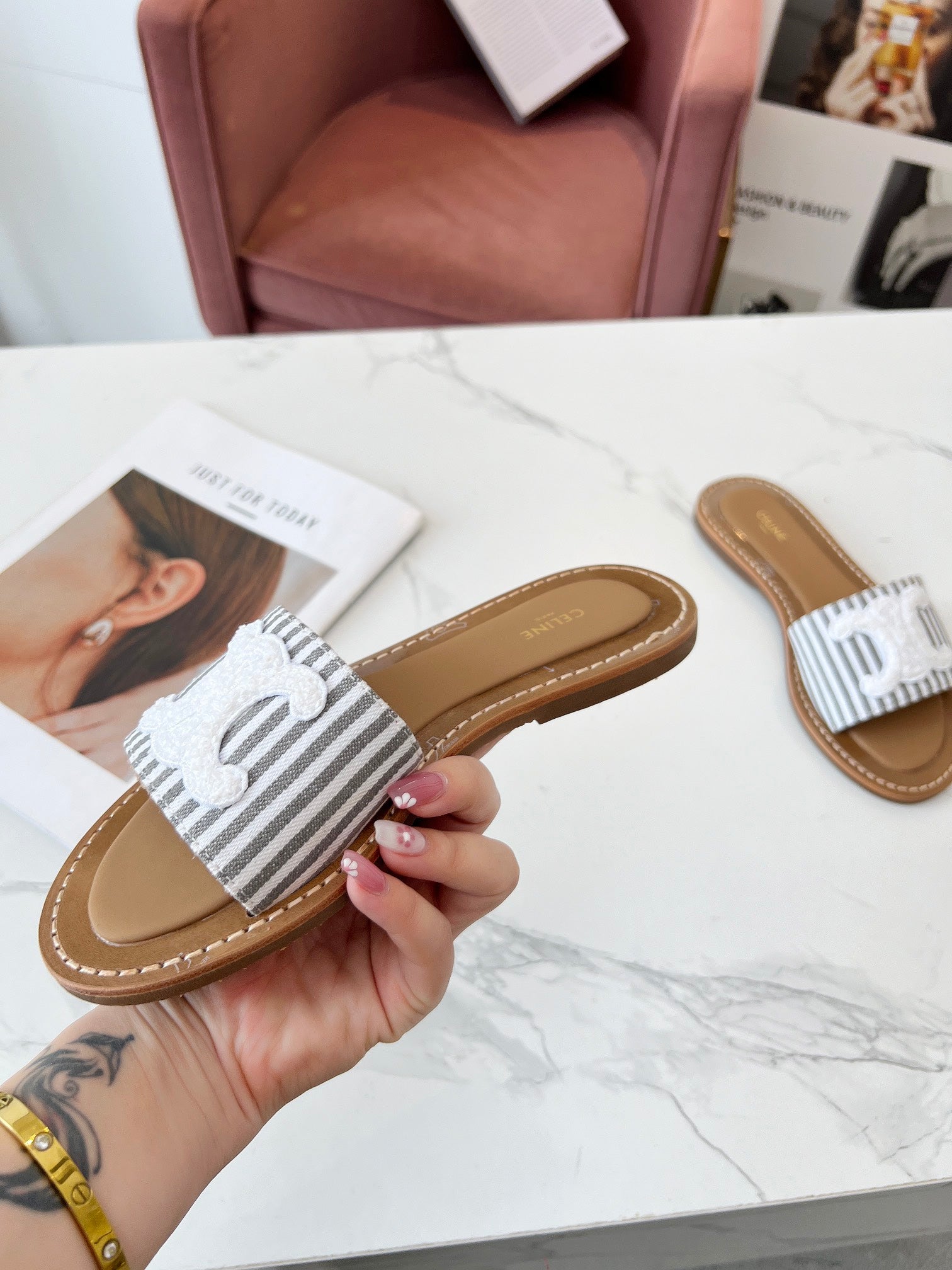 Celine 25C Slippers Gray mix White Fabric with Calfskin 238171