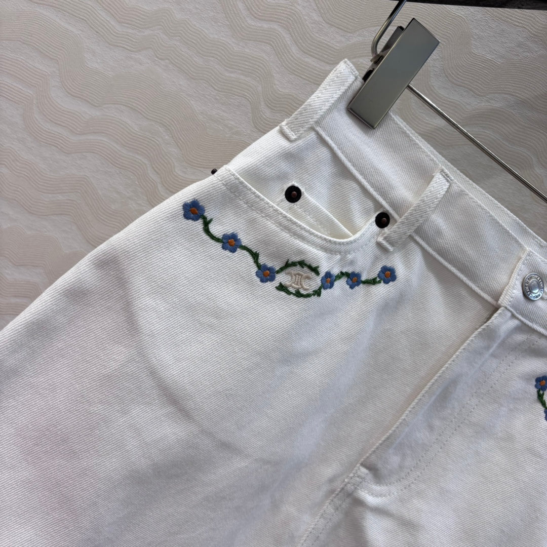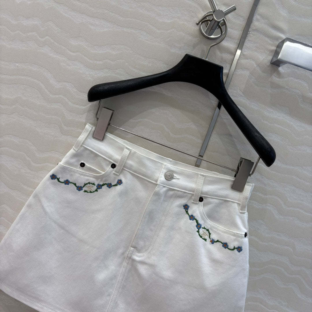 Celine 25 Embroidered Small Flower Skirt White Cotton