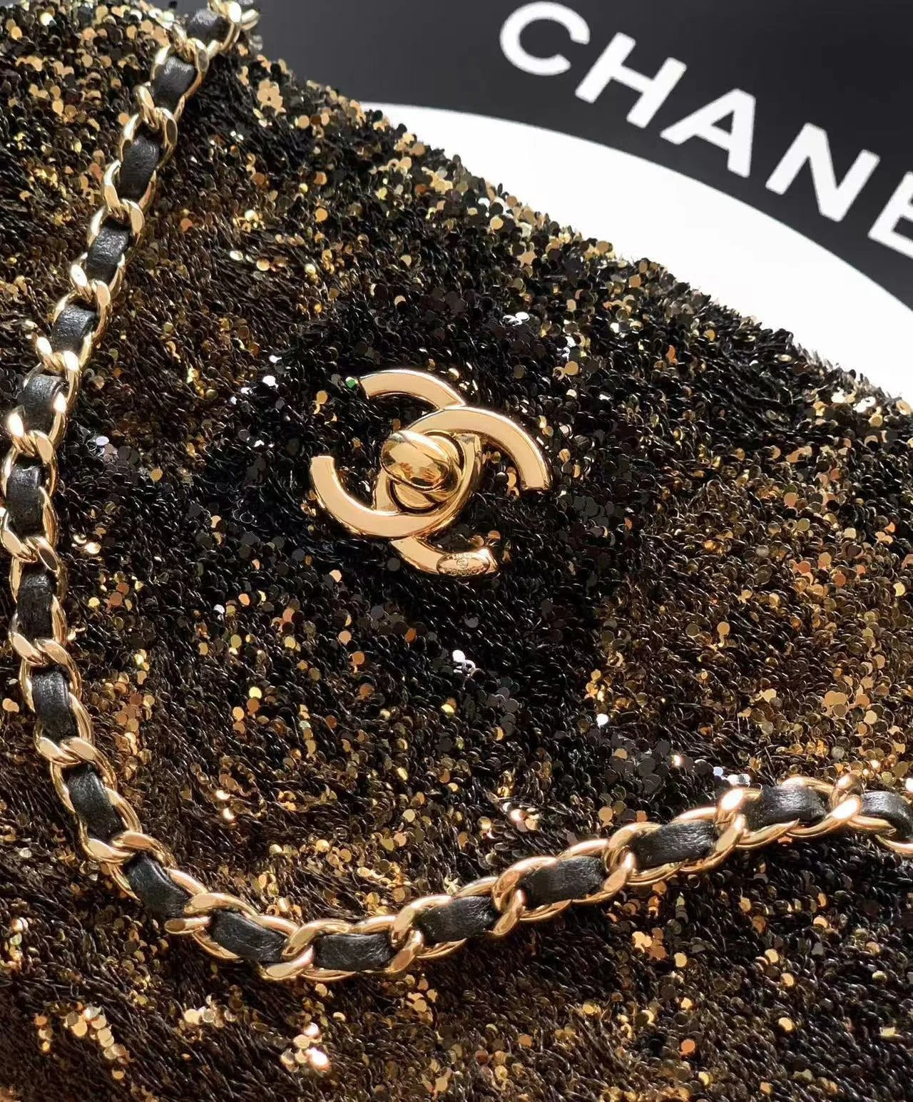CC 20 SEQUINS FLAP BAG IN BLACK MIX BROWN