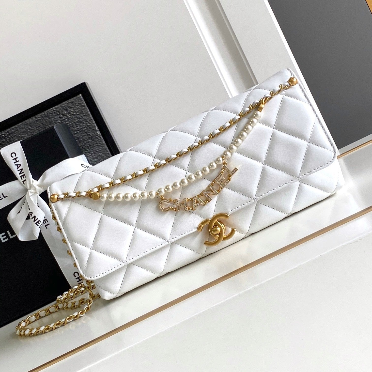 CC WAIST 24 BAG IN WHITE CALFSKIN WITH PEARL CHAIN AND GOLD HARDWARE