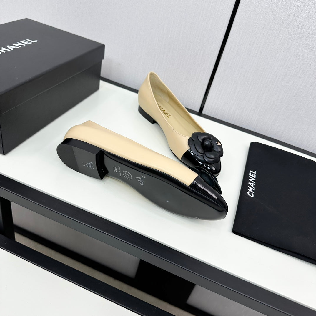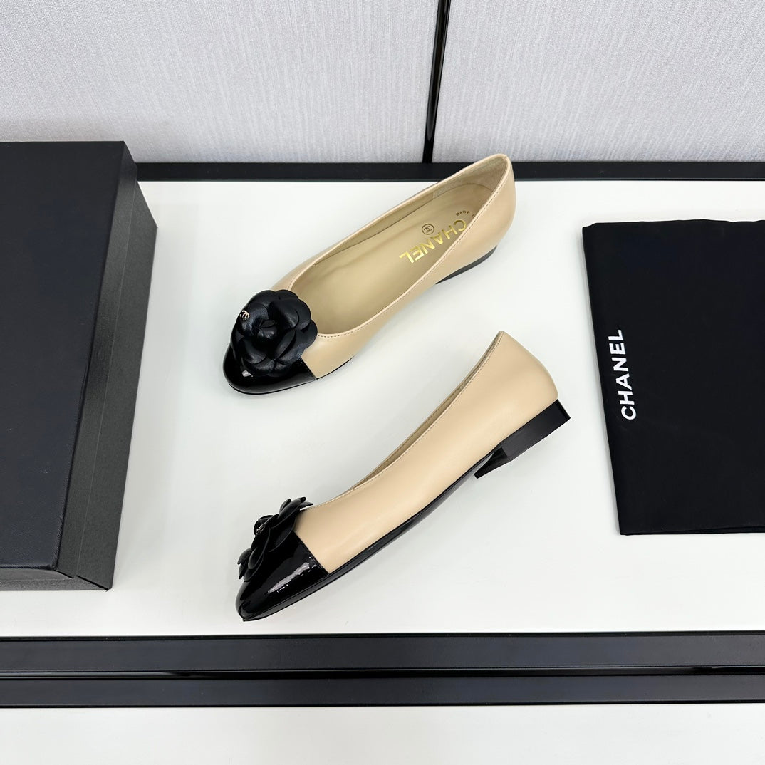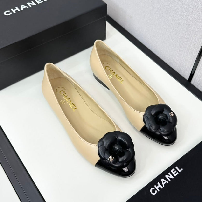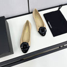 ballet flat flower beige calfskin black patent calfskin