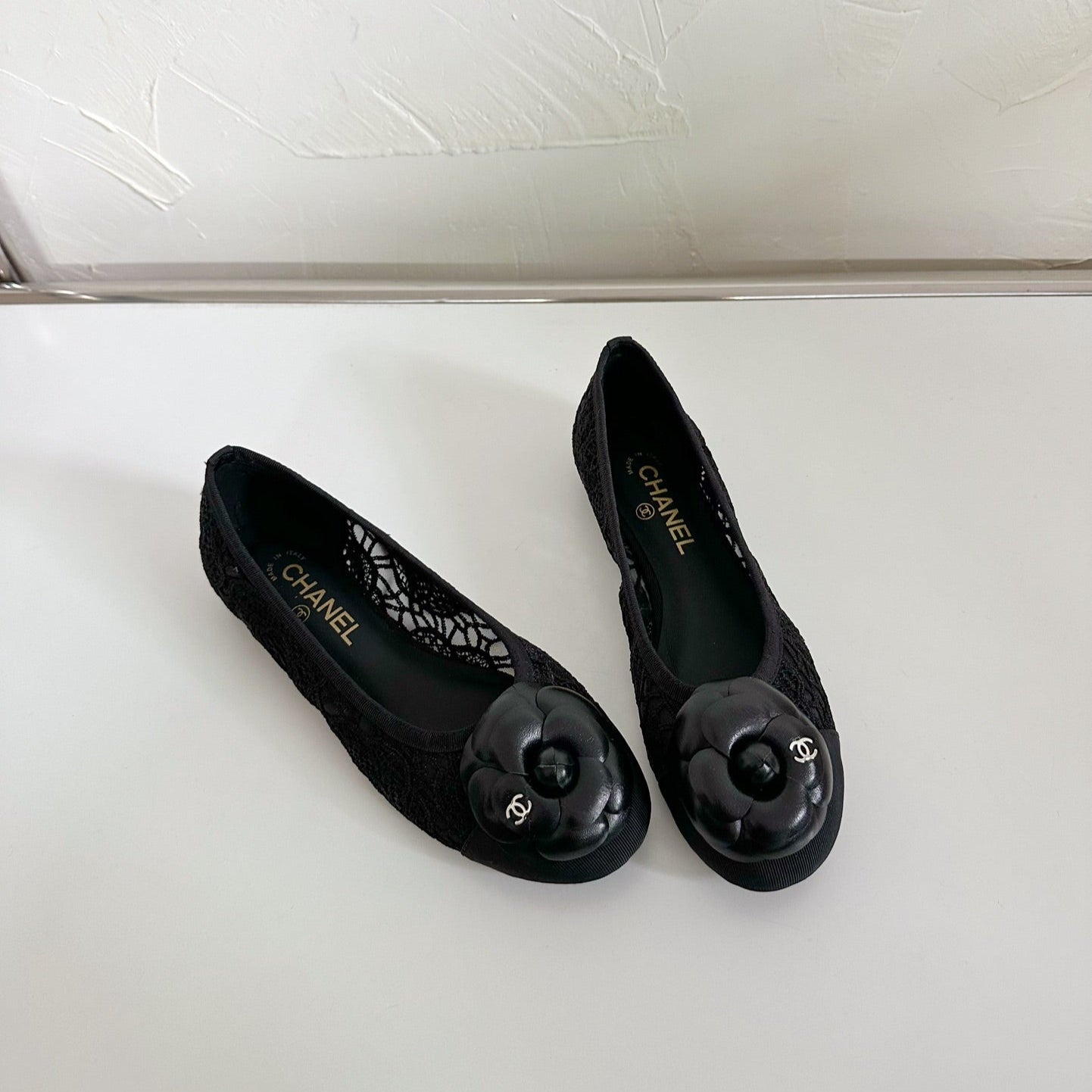 Ballet Flats White Lace Mesh Black Grosgrain Flower