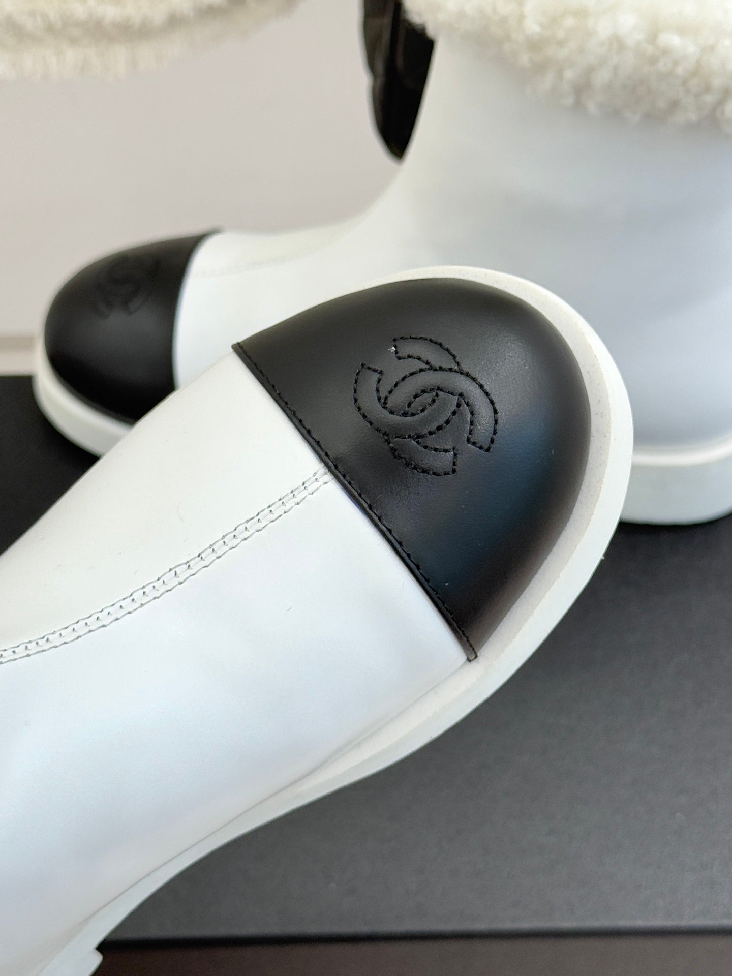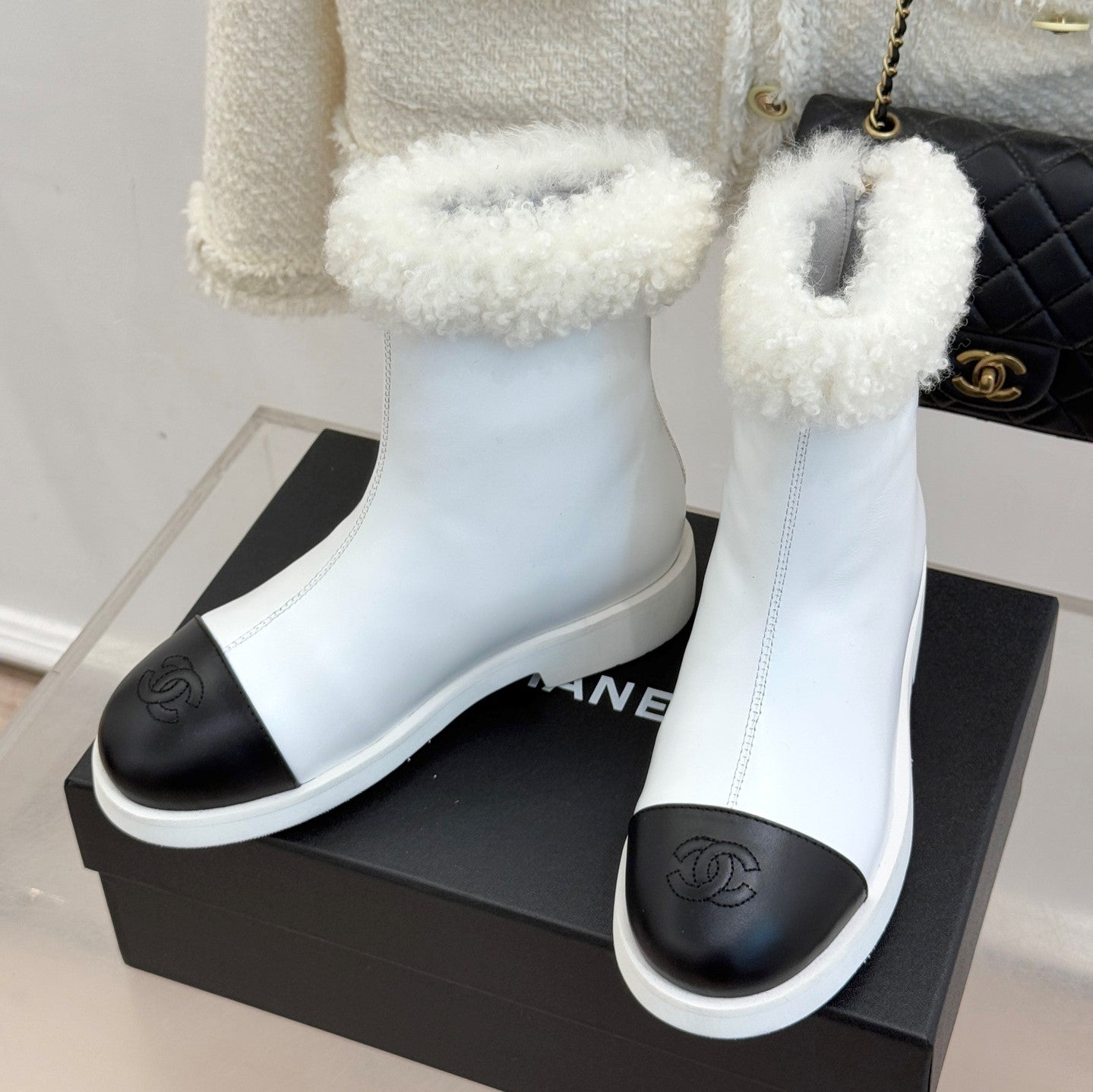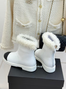 CC 25K Double C Colorblock Furry Snow Boots Black White Leather 512070