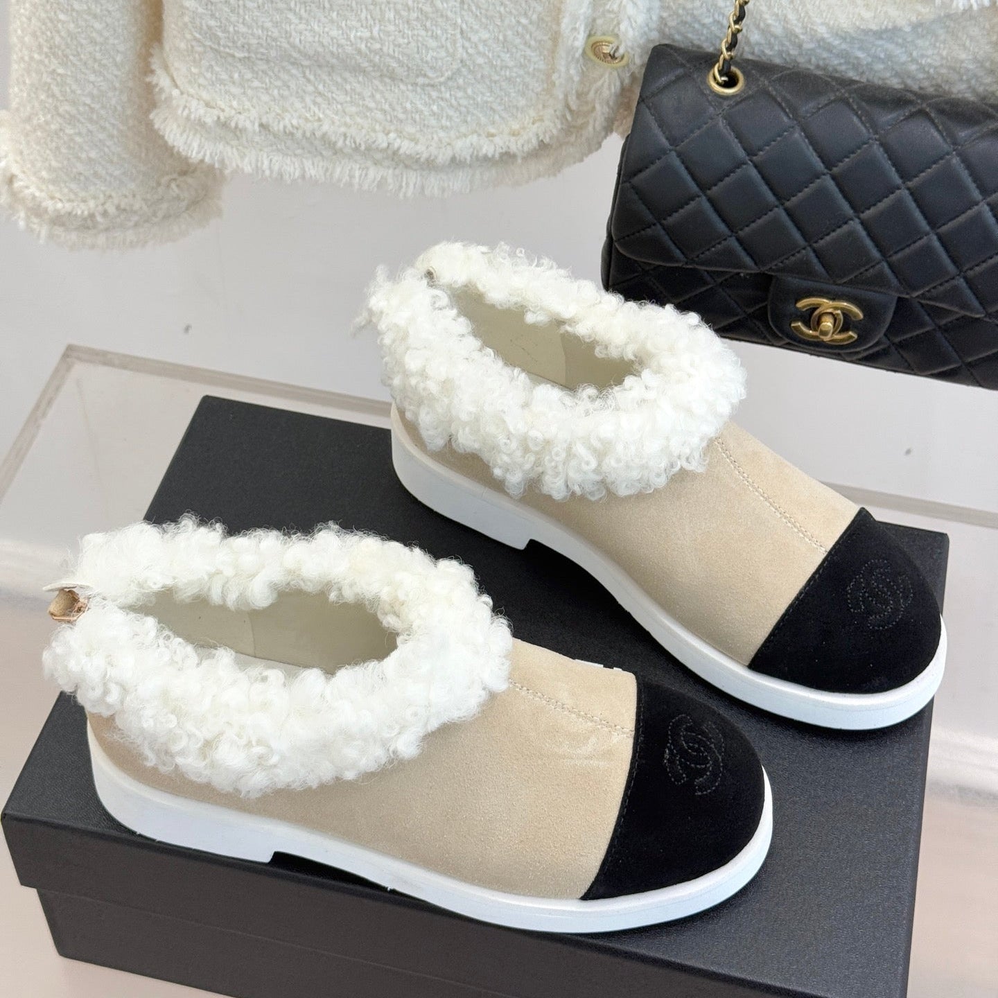 CC 25s Furry Snow Boots Beige Black Suede Wool 512063