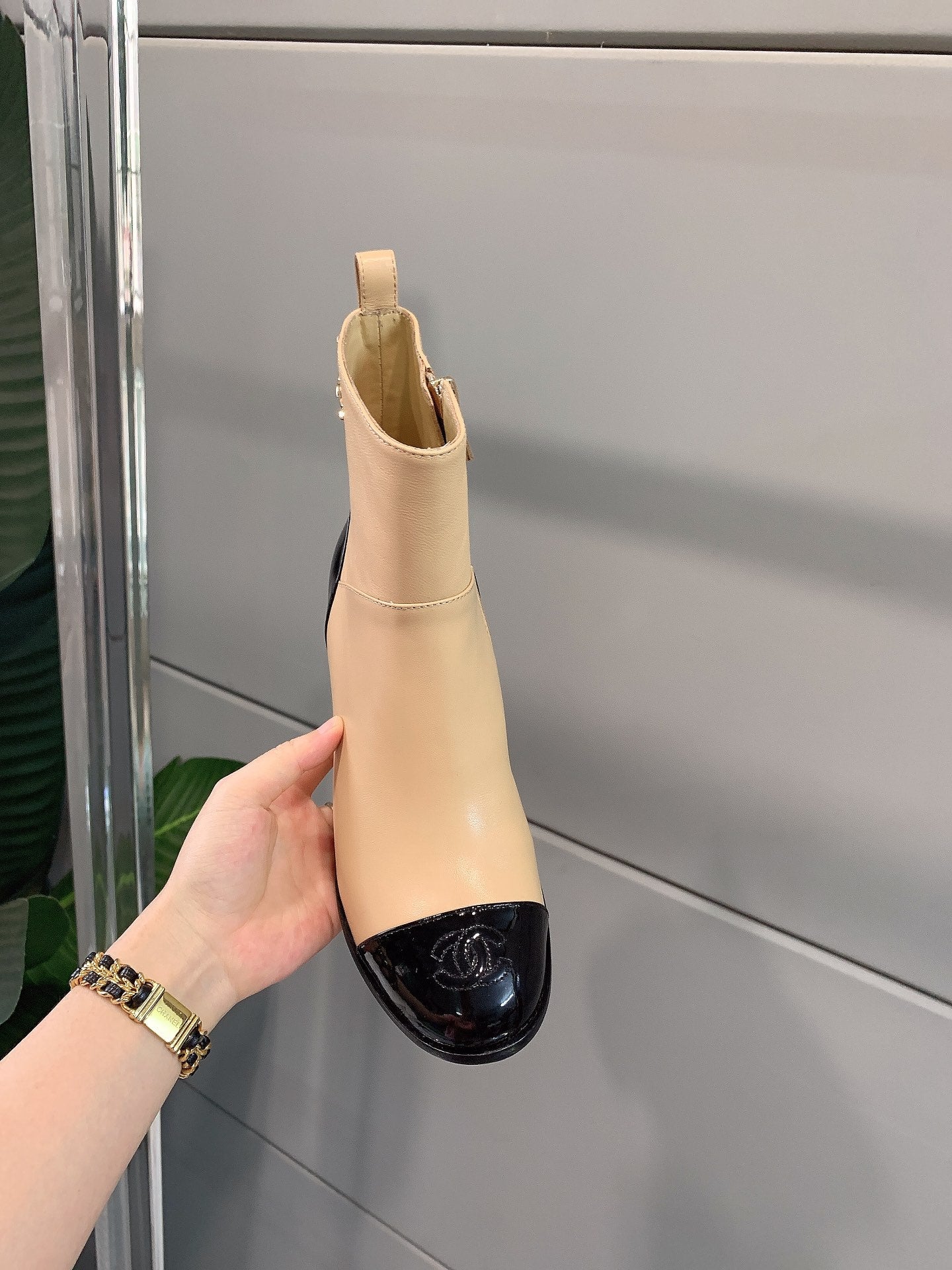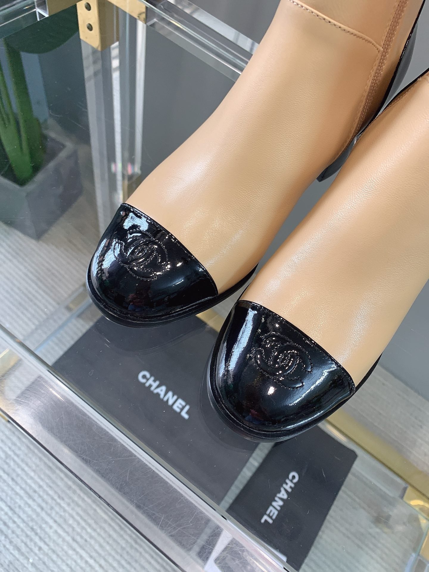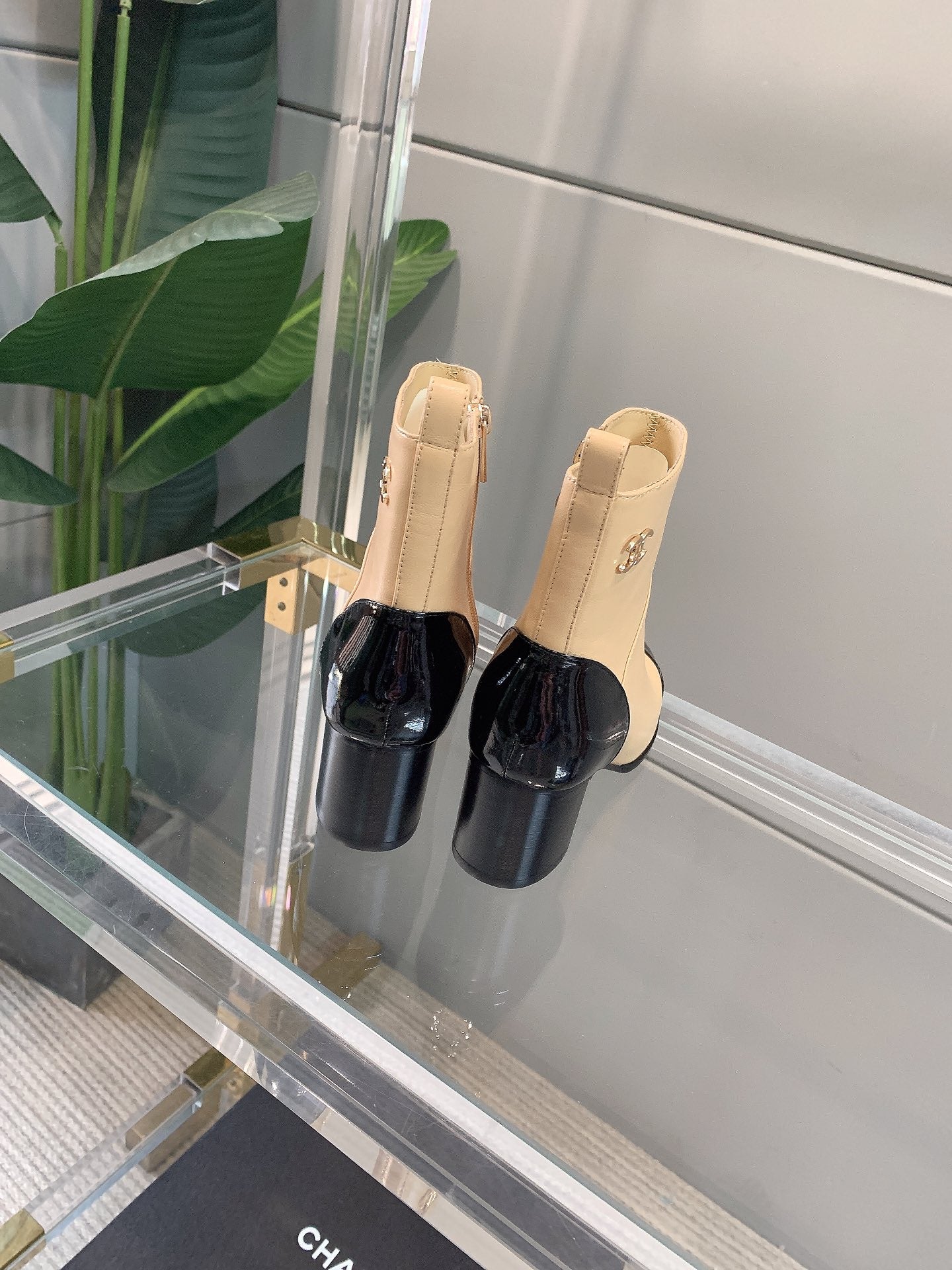 CC Block Heel Ankle Boots 60mm Black Beige Patent Leather Sheeepskin 464555