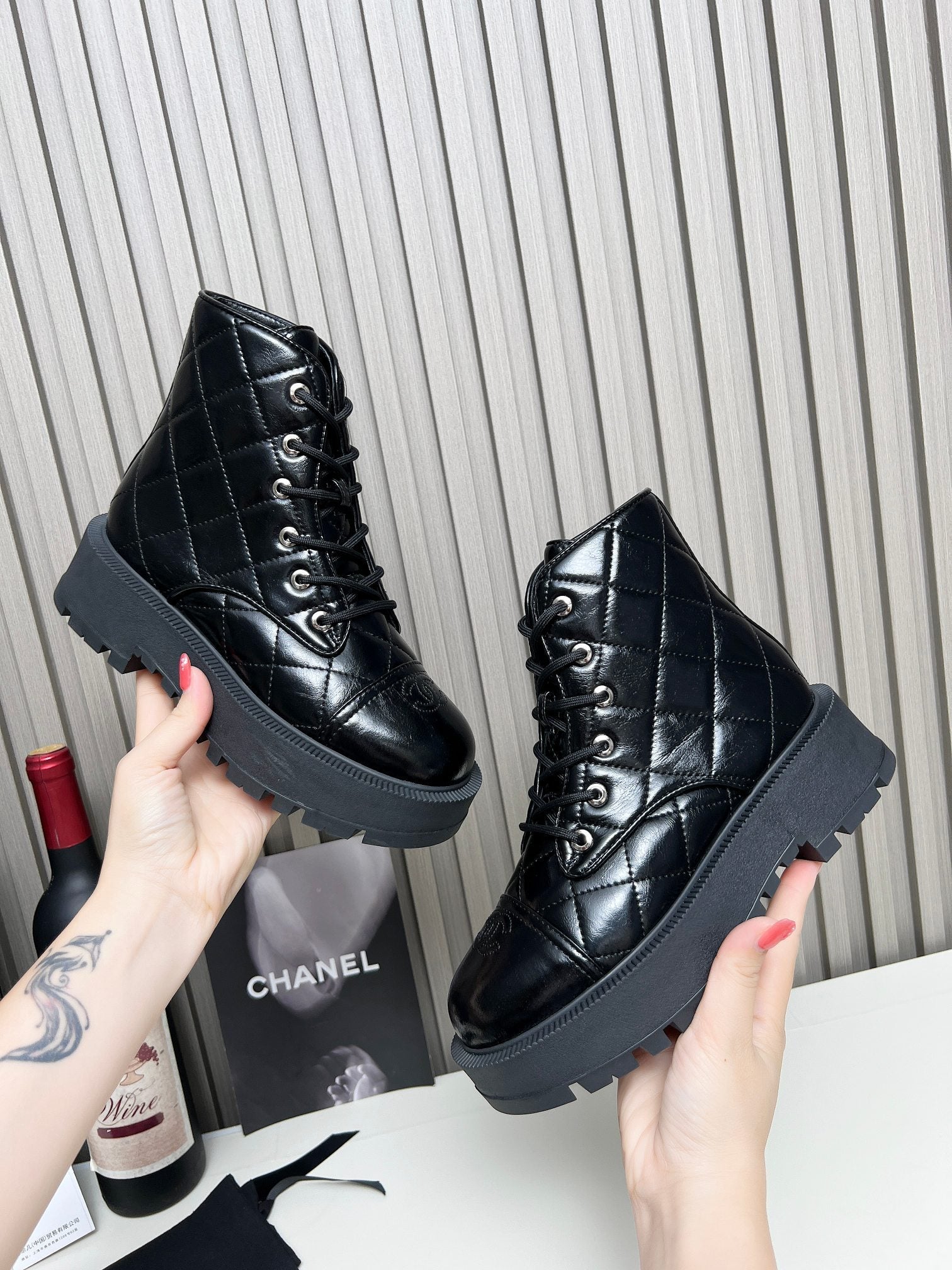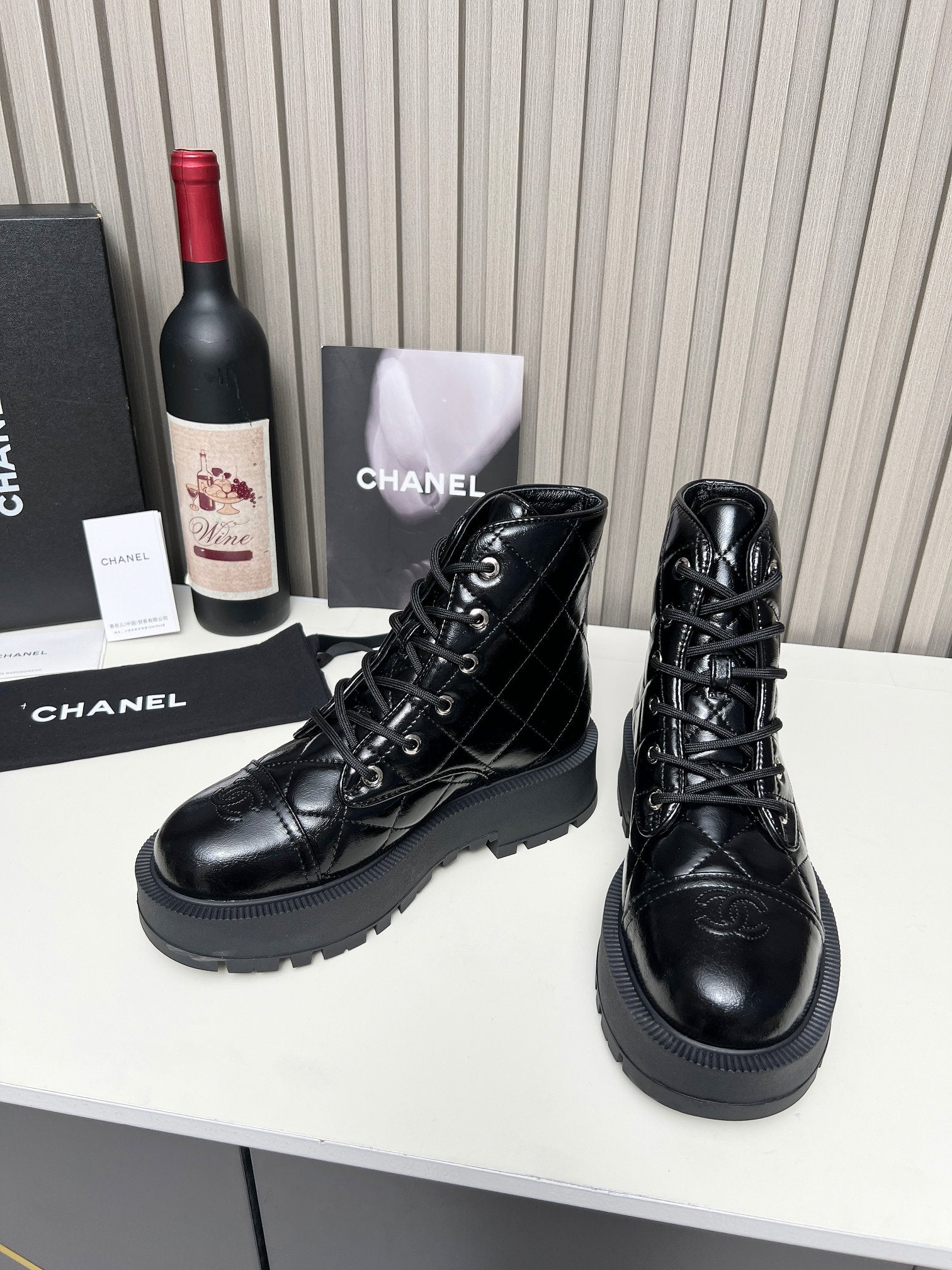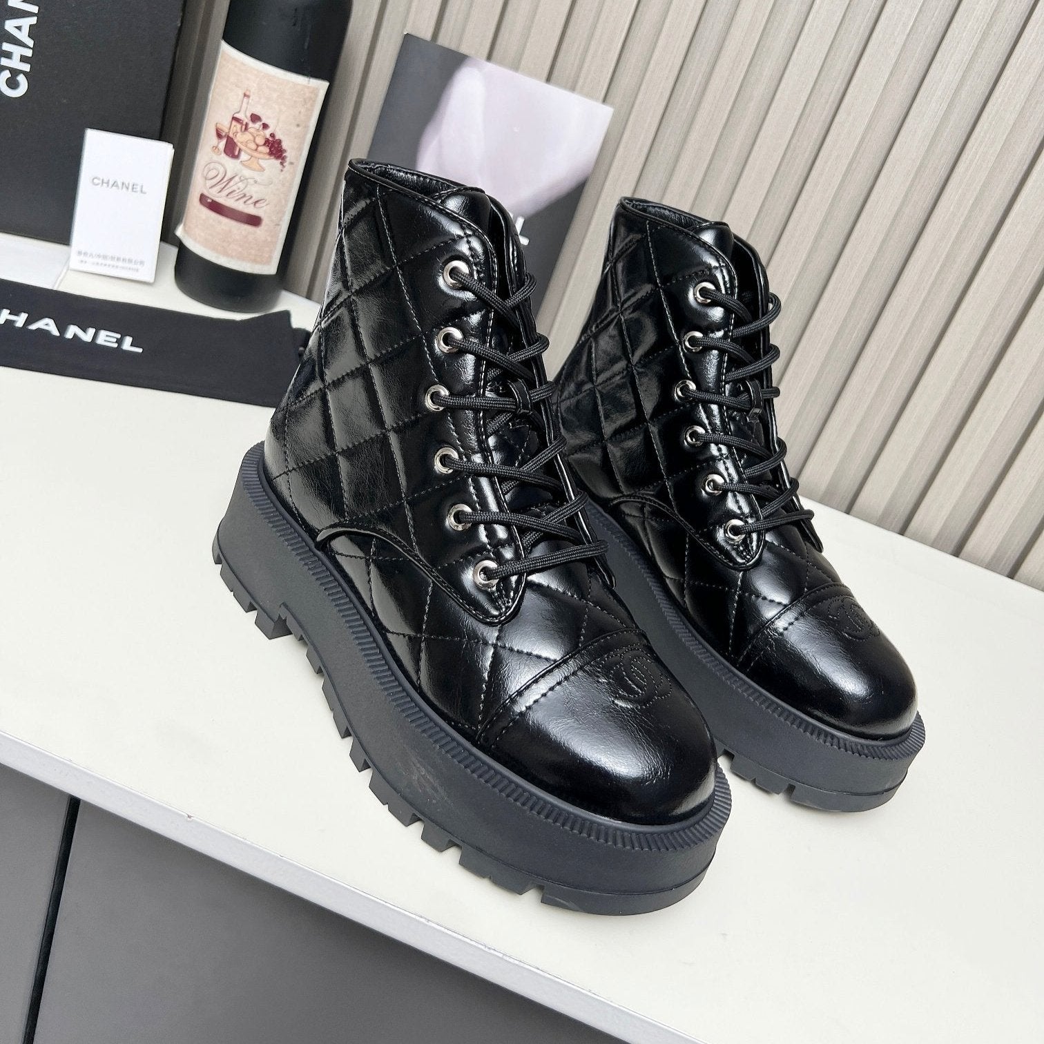 CC Combat Boots In Glossy Black Quilted Lambskin 944580