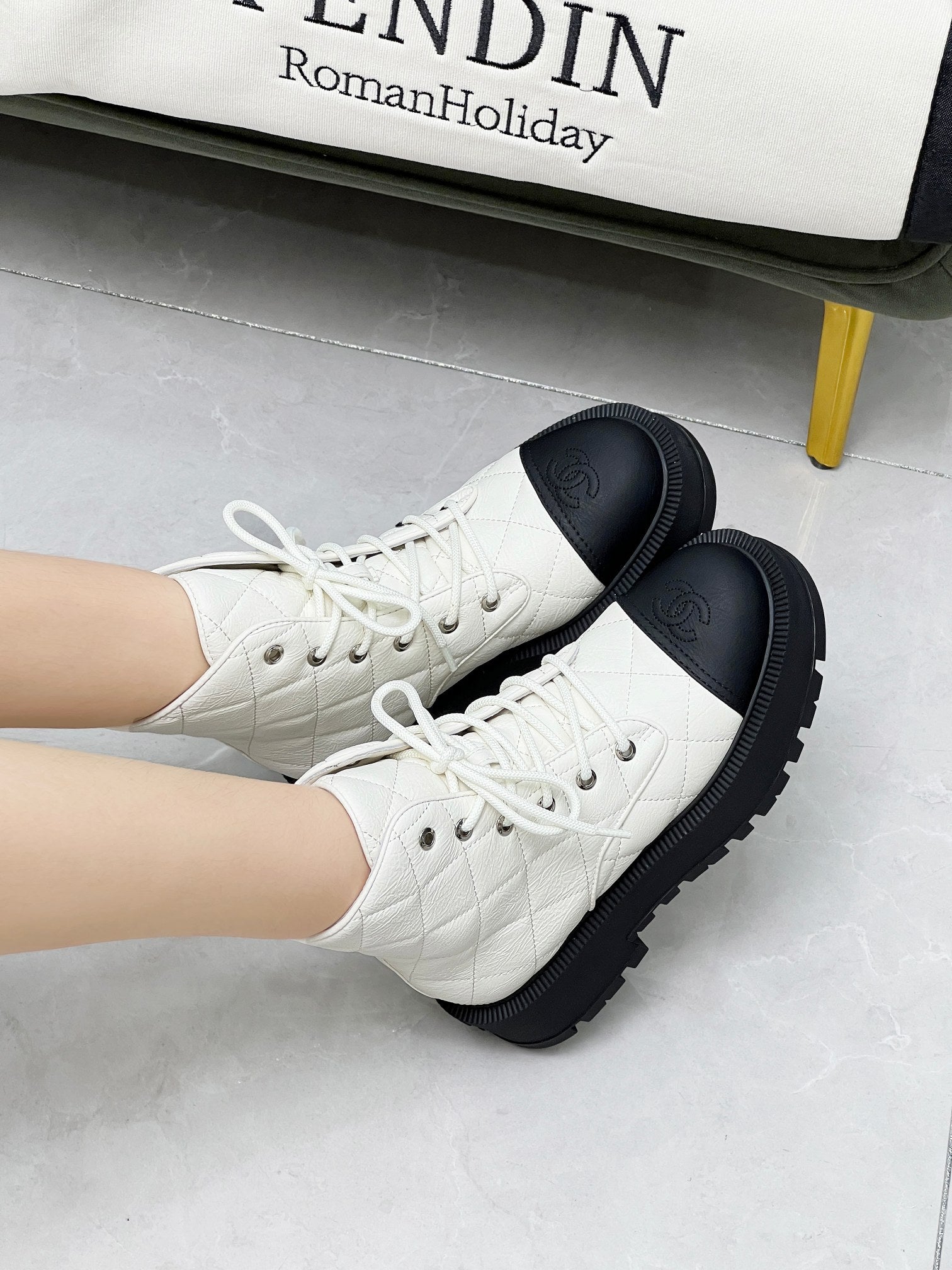 CC Combat Boots In White Mix Black Quilted Lambskin 944577