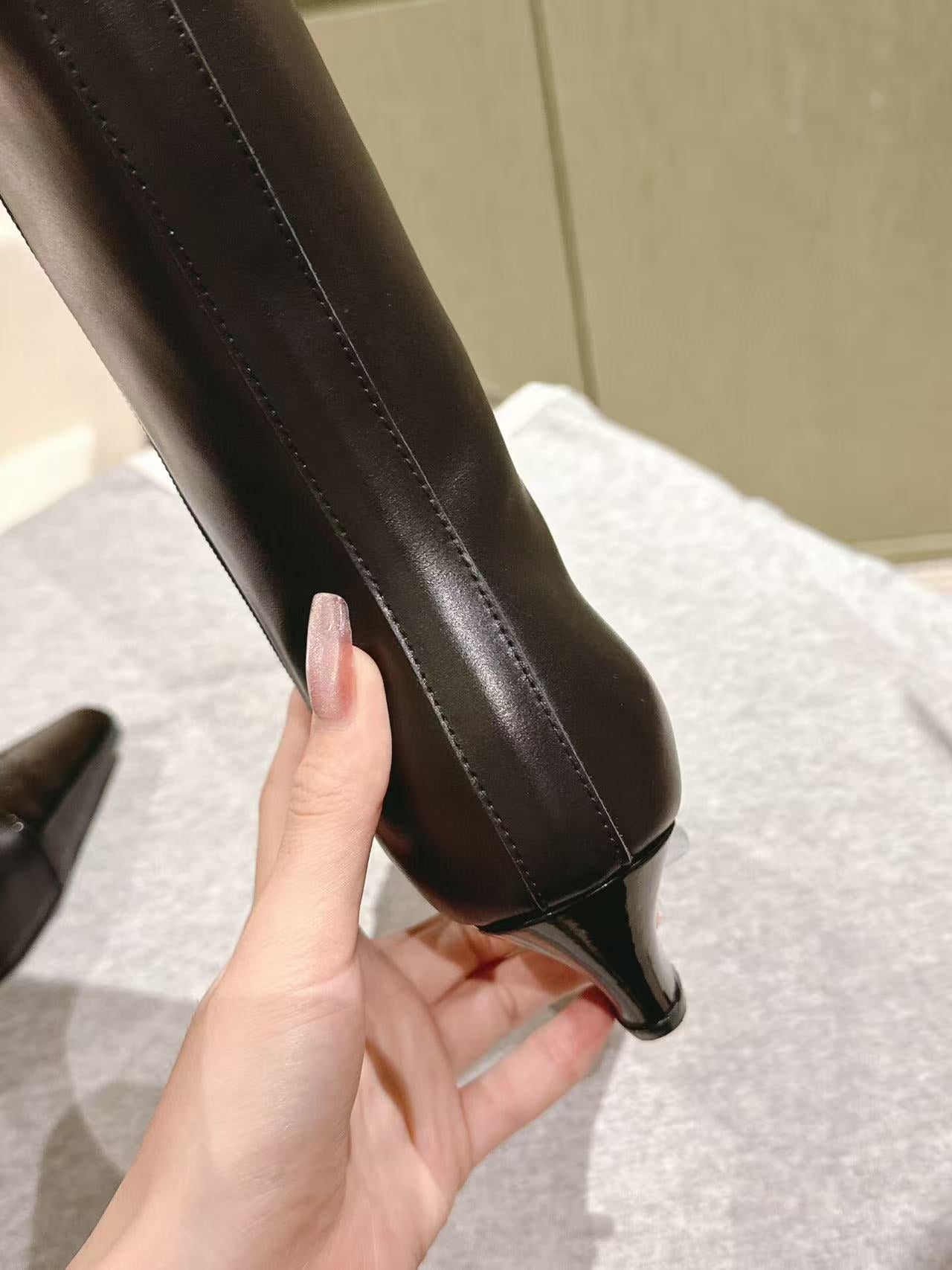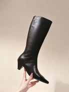 CC Knee-High Pointed Toe Chunky Heel Boots 50mm Black Sheepskin