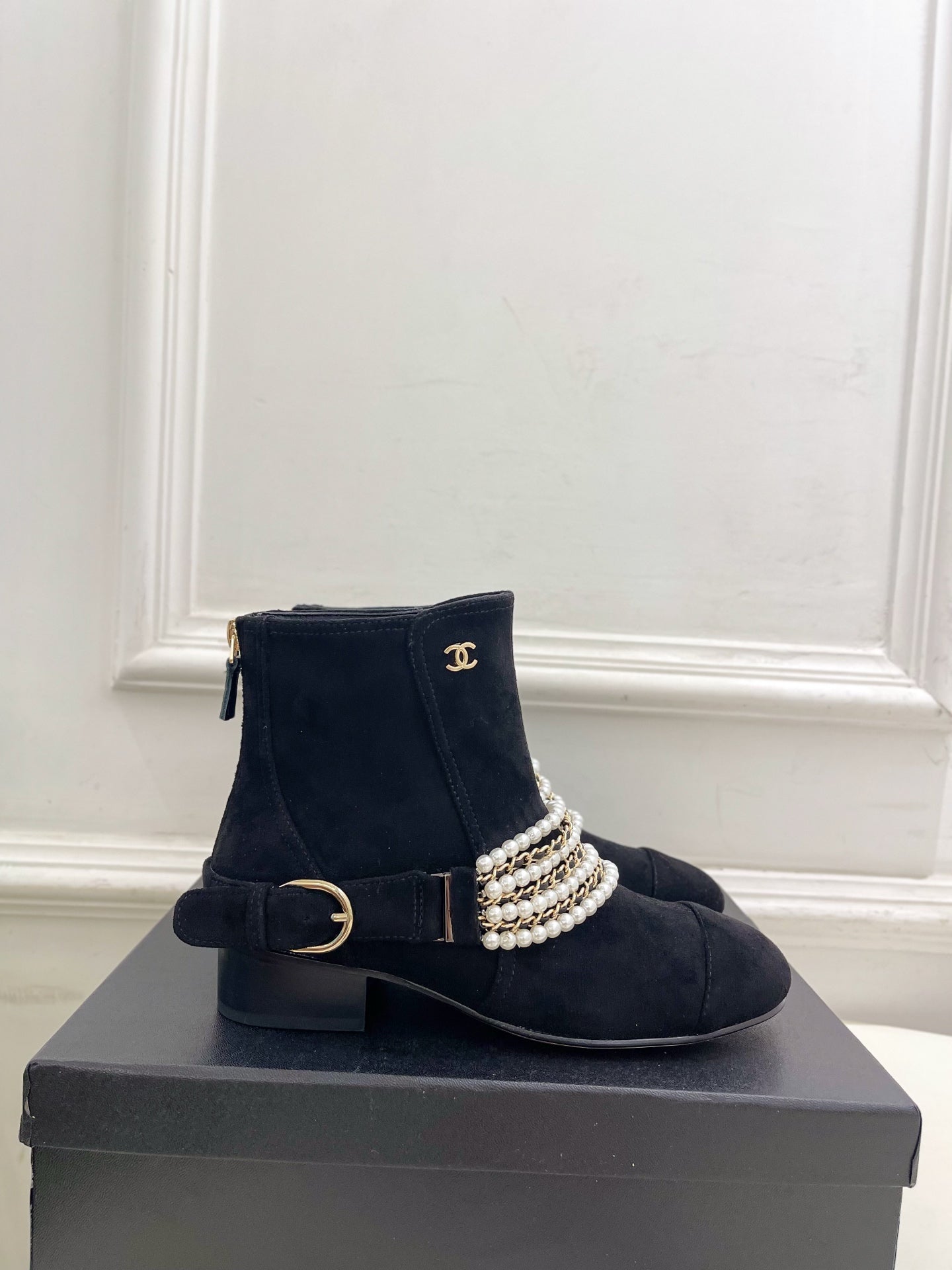CC Pearl Chain Ankle Boots Booties 35mm Black Suede 425461