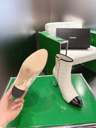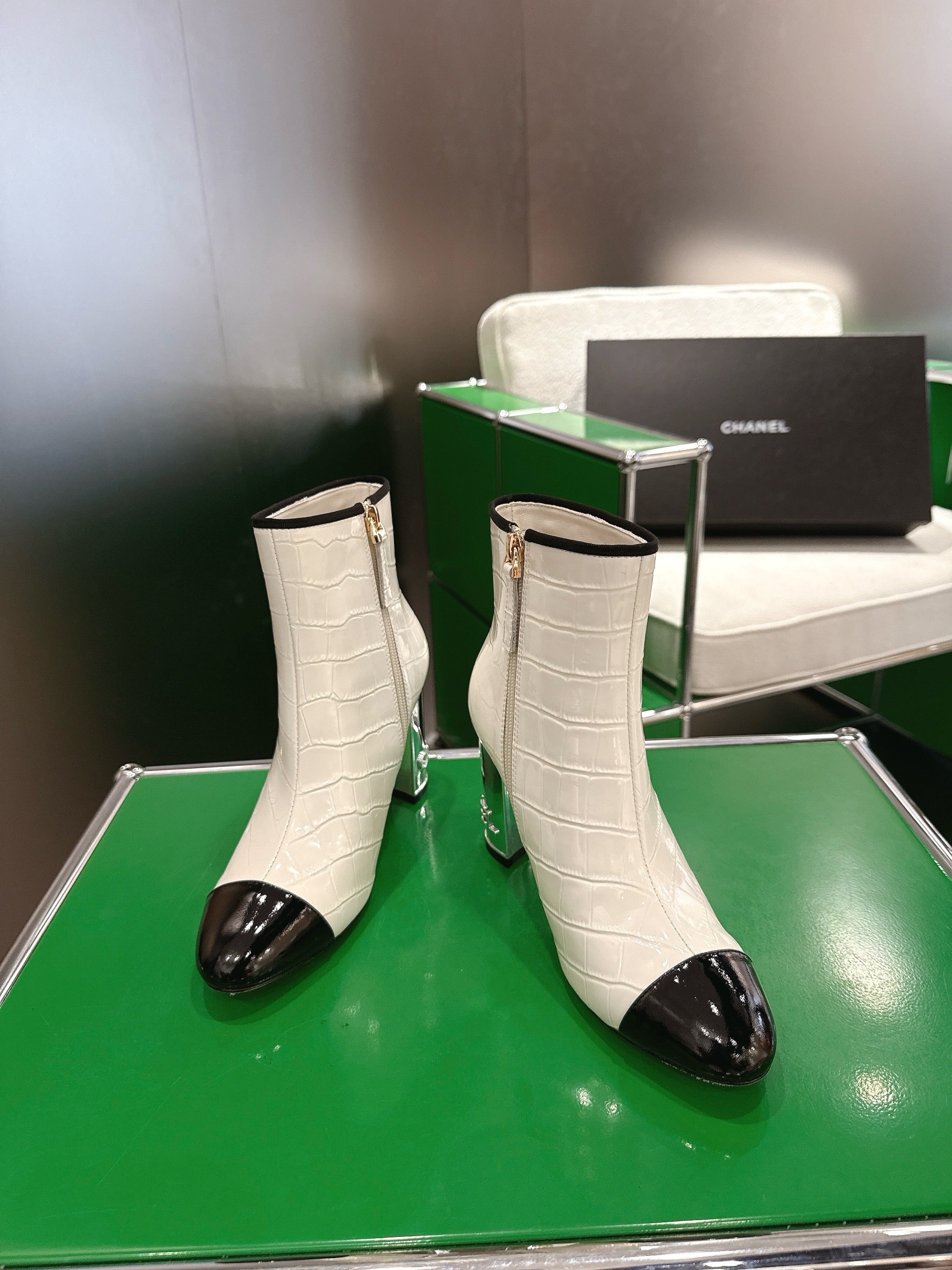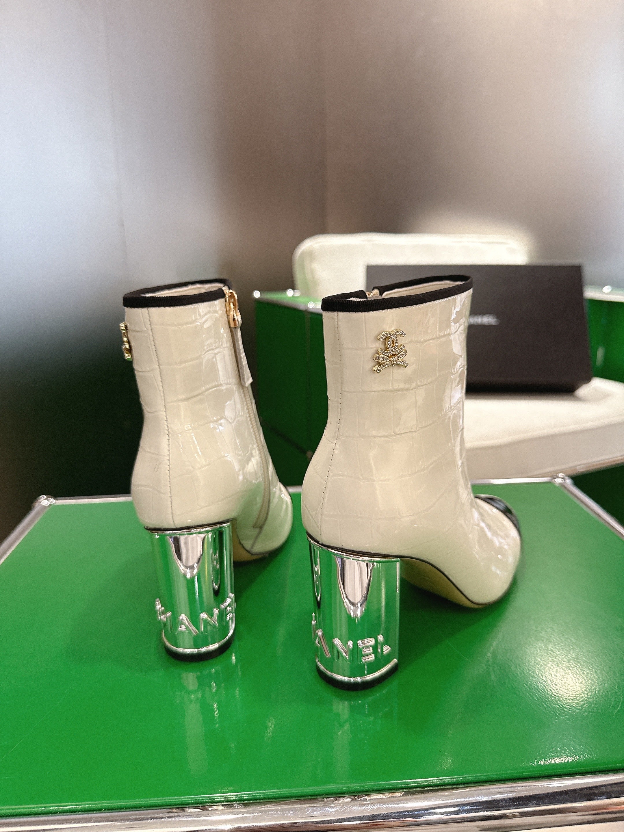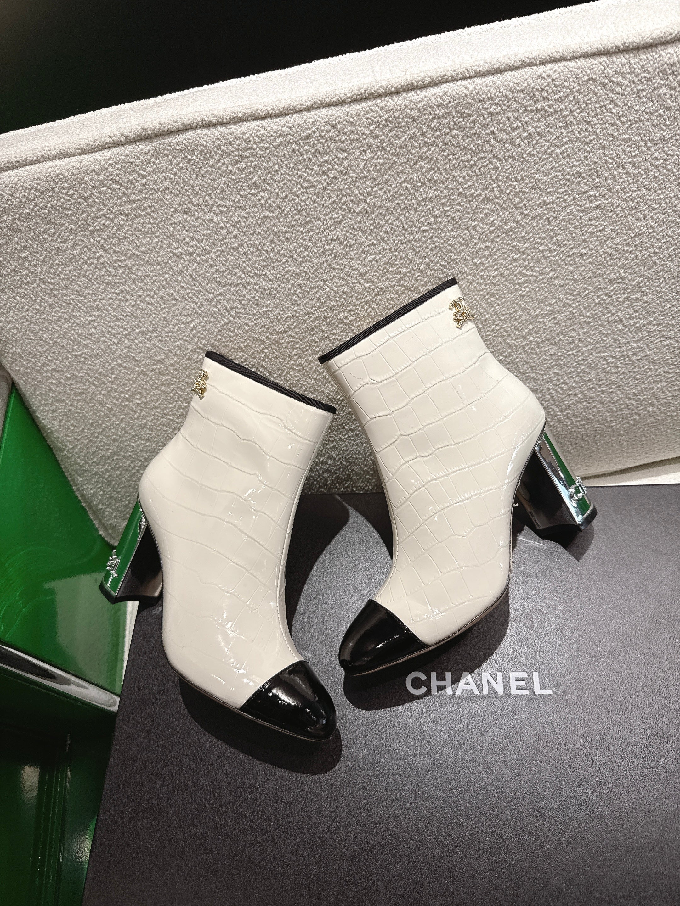 Chanel 2025ππ High Heeled Ankle Boots Cream and Black Glossy Leather 507546