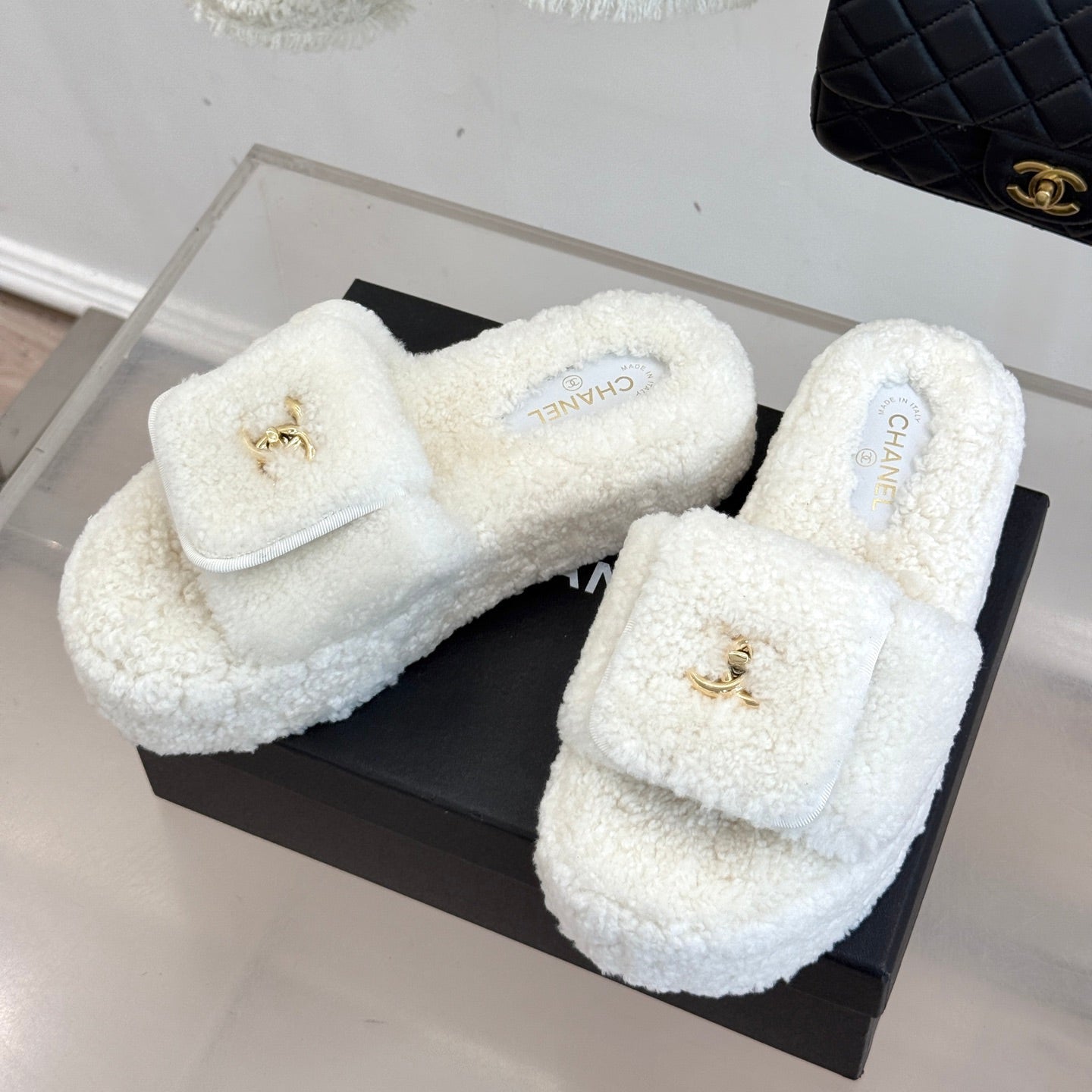 Chanel 25 Buckle Flip-up Thick-soled Slippers White Wool 465383