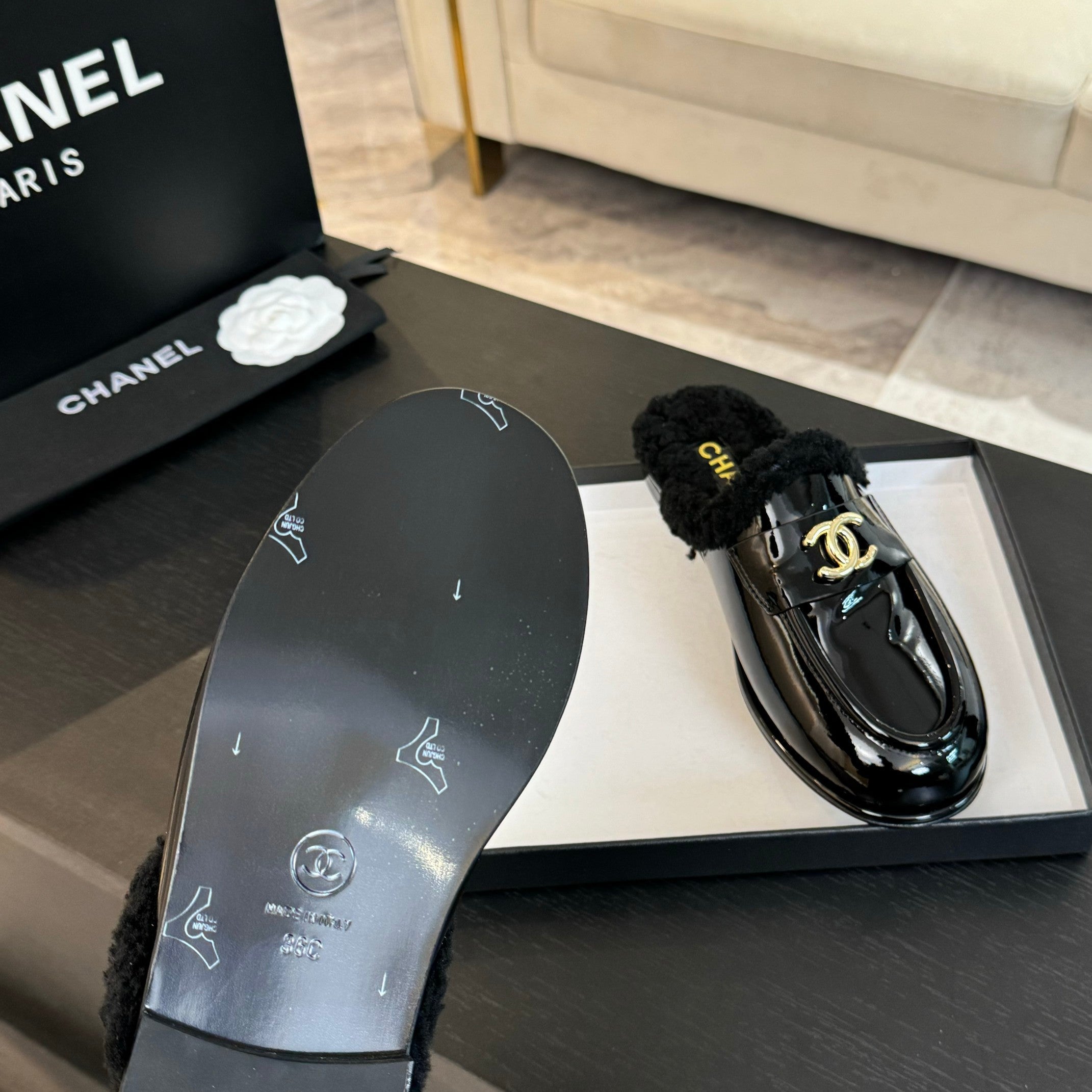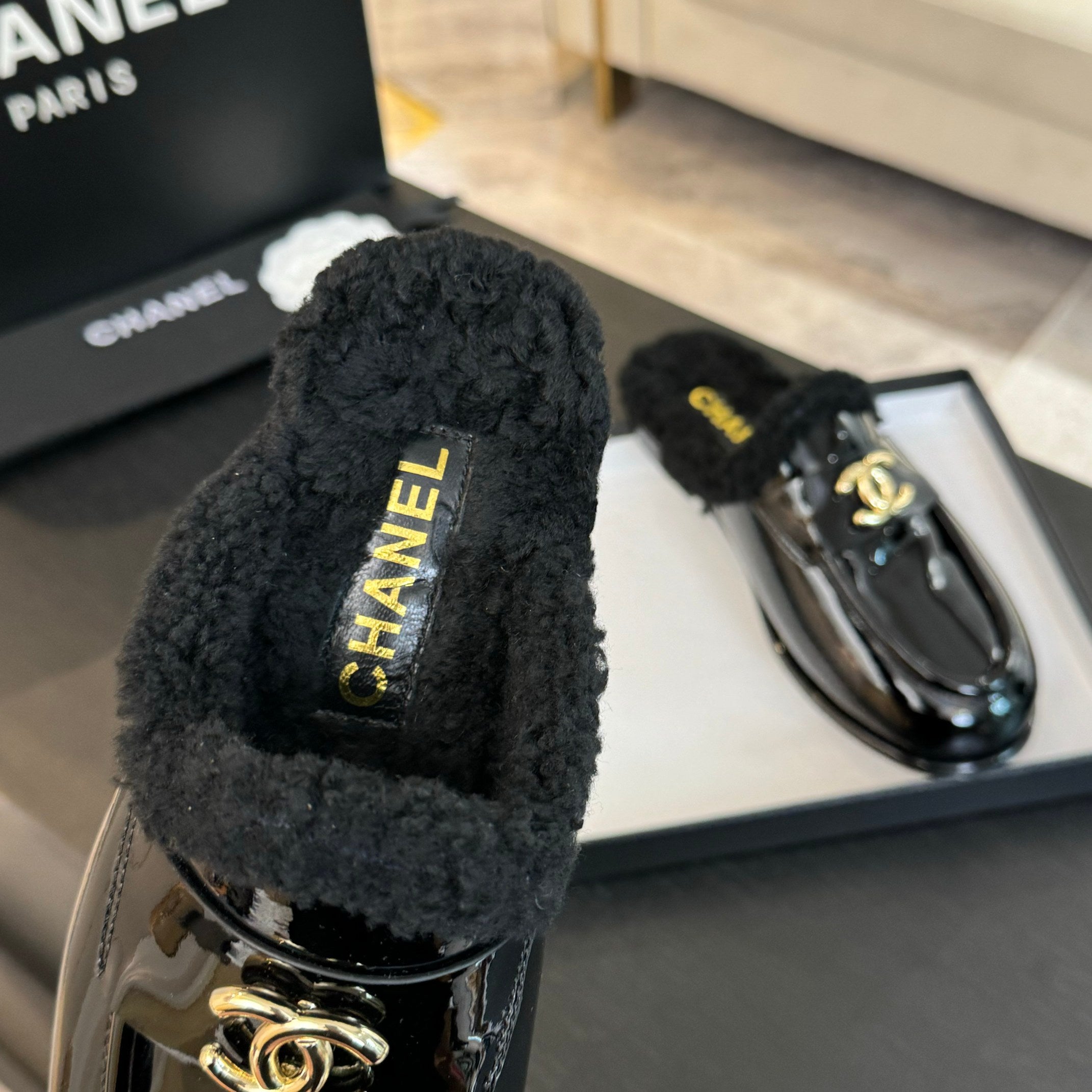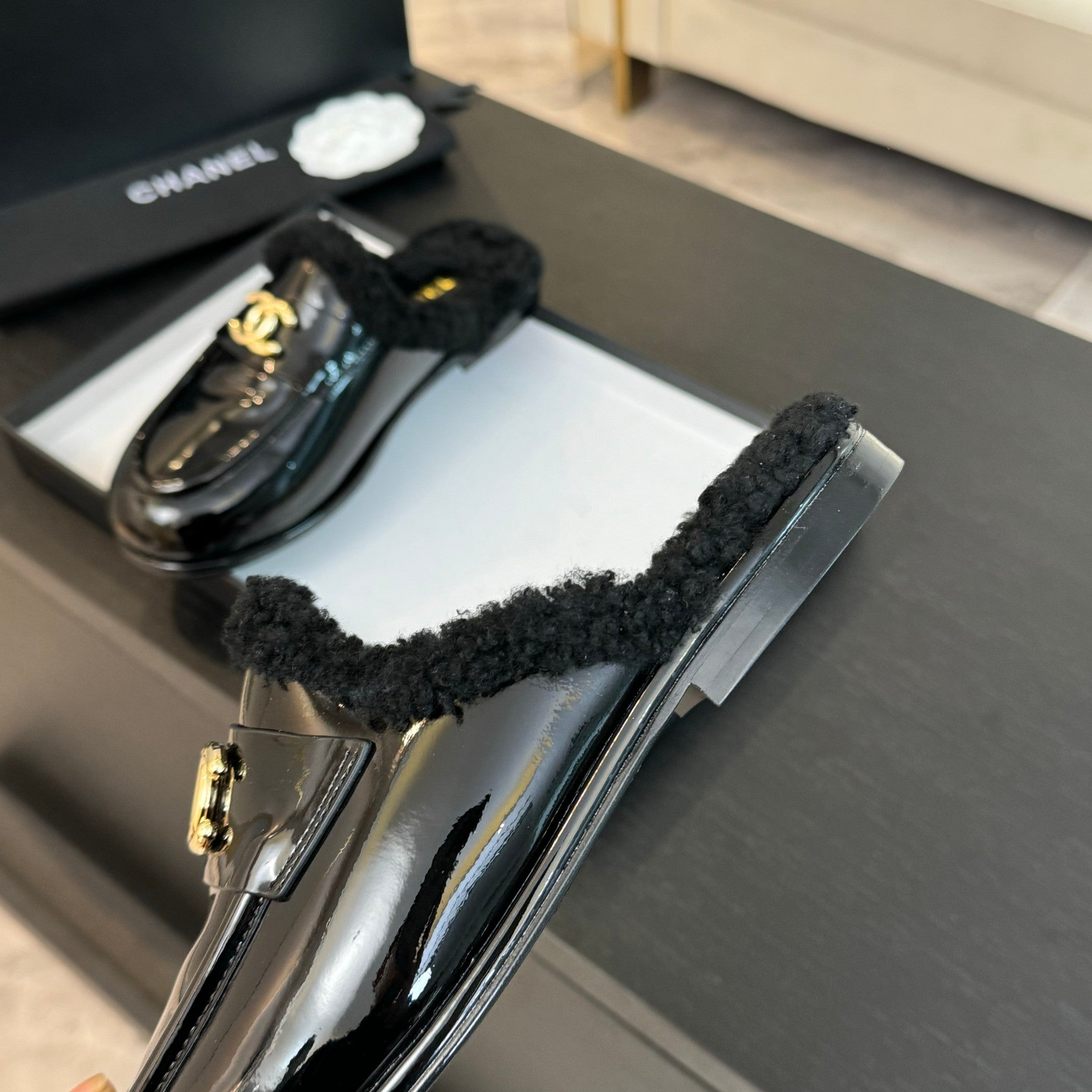 CC Mule Black Patent Calfskin Lamb Wool
