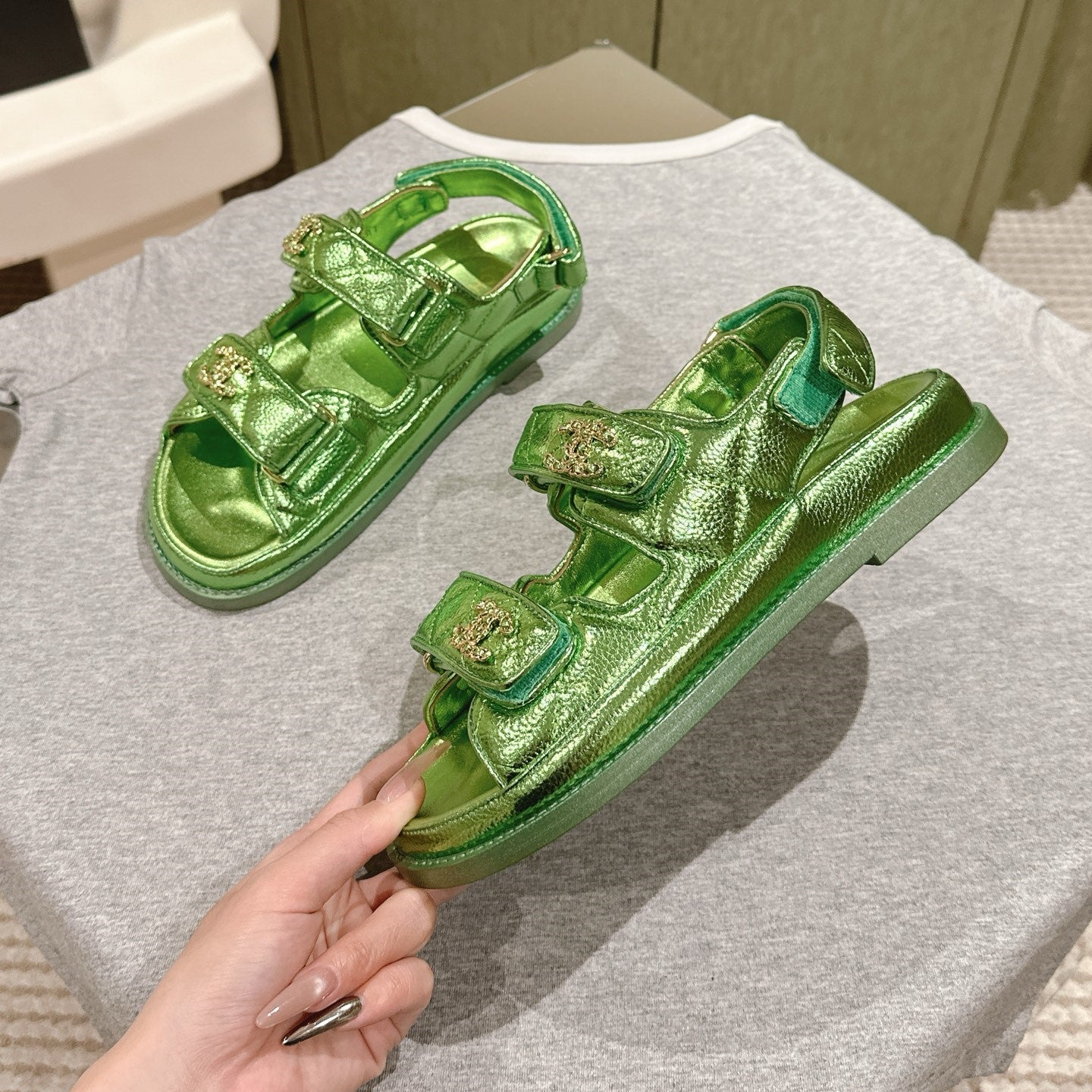 CC 25C Dad Sandals Green Metalic Grained Calfskin 462232