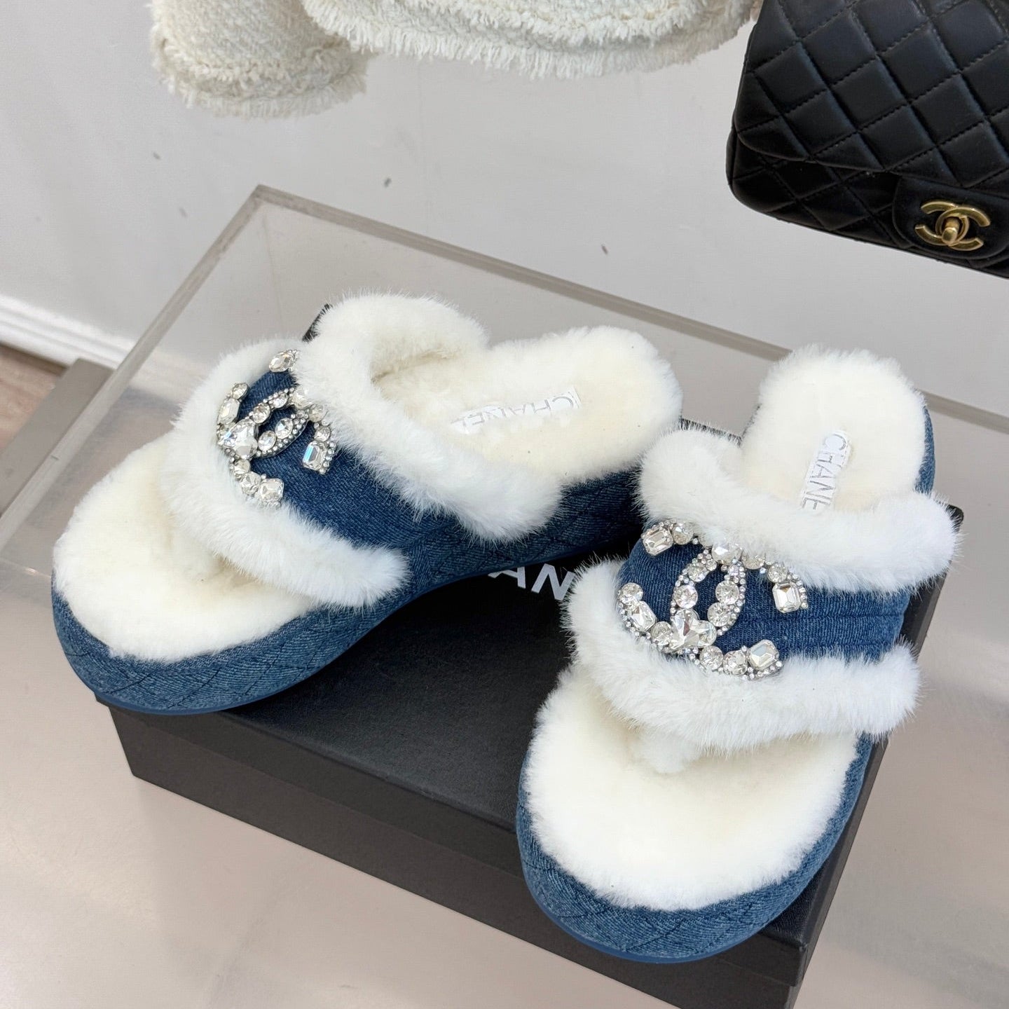 CC slipper double C rhinestone buckle white blue wool 512053