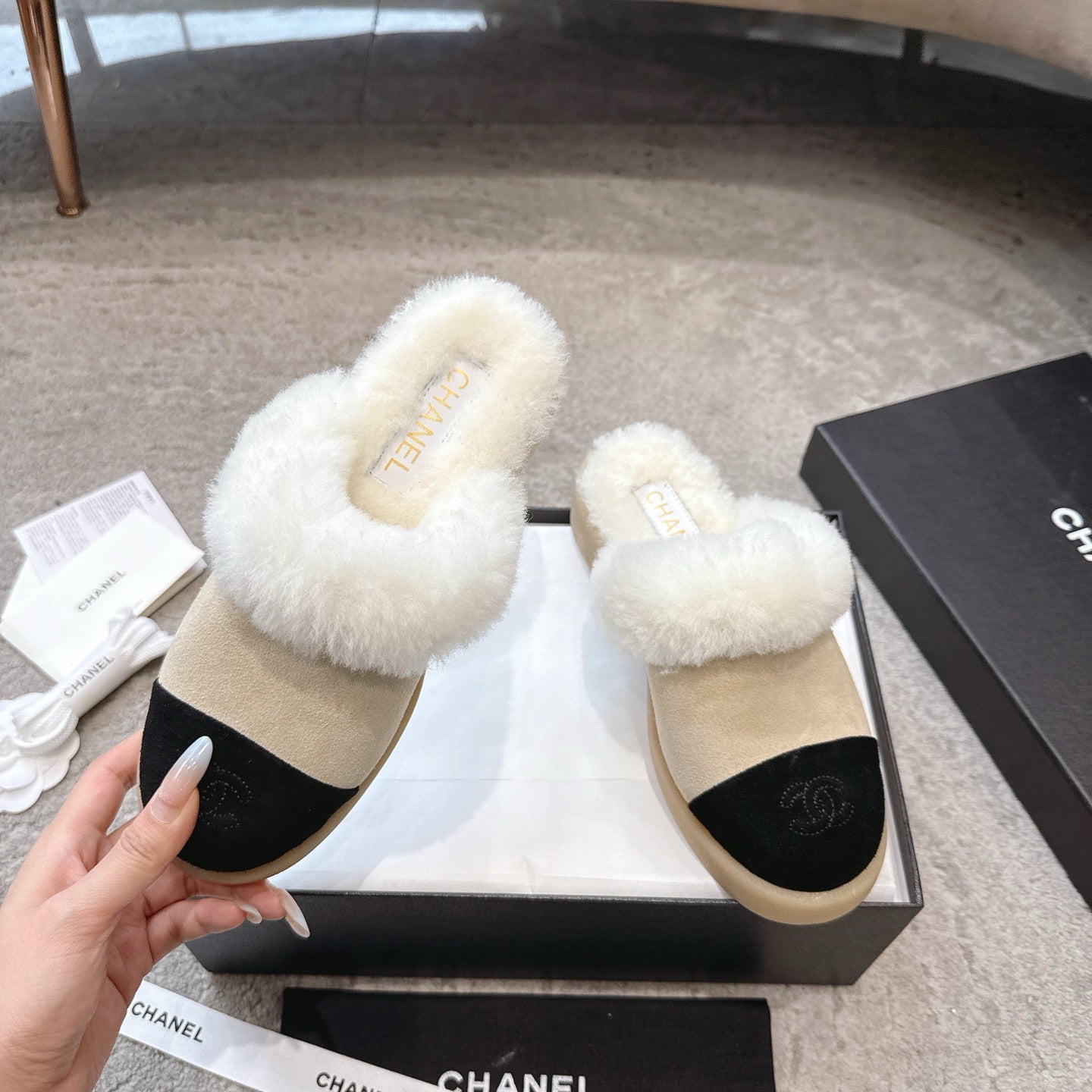 CC furry mule light beige black suede and wool 532577