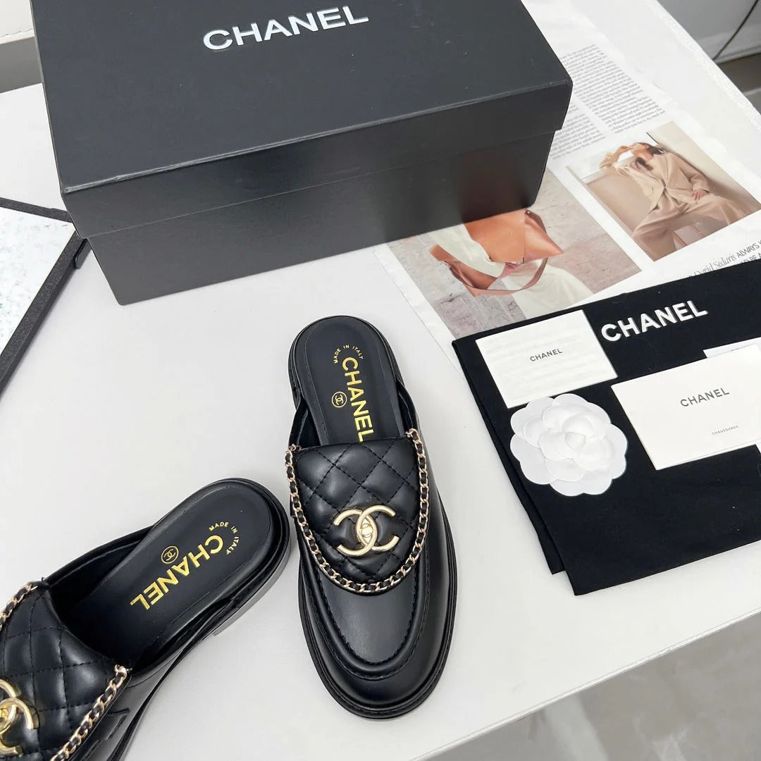 CHANEL 25S MULES WITH CHAIN DETAIL IN BLACK CALFSKIN GOLD HARDWRE