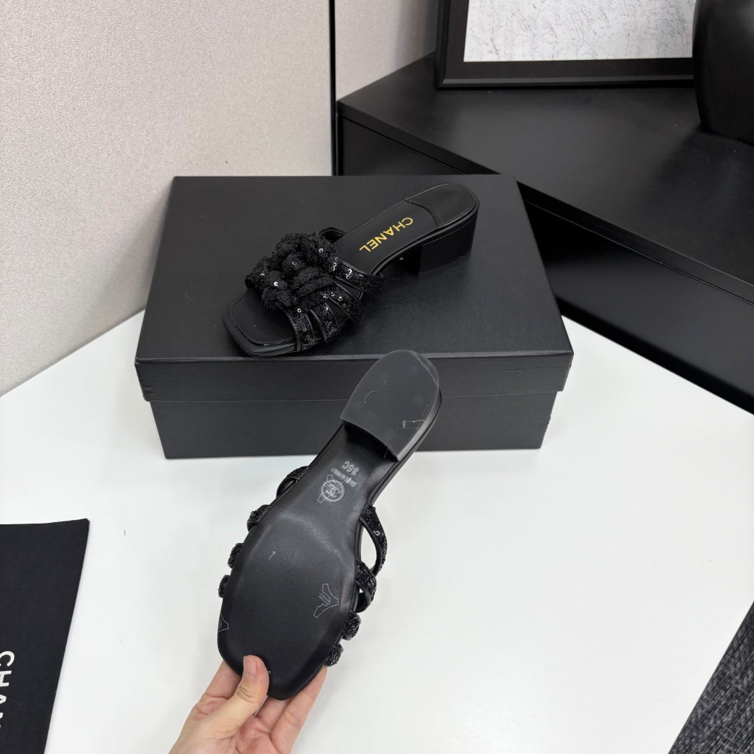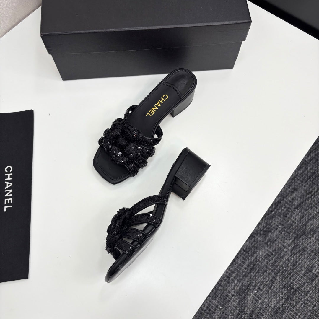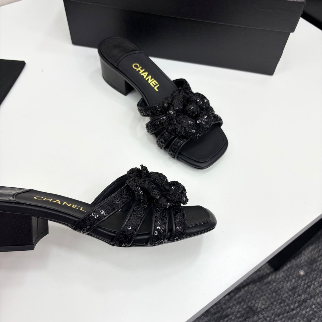 CC 25 Camellia Open Heel Mule Sandals 50mm Black Coarse Glitter Fabric And Sheepskin 368856