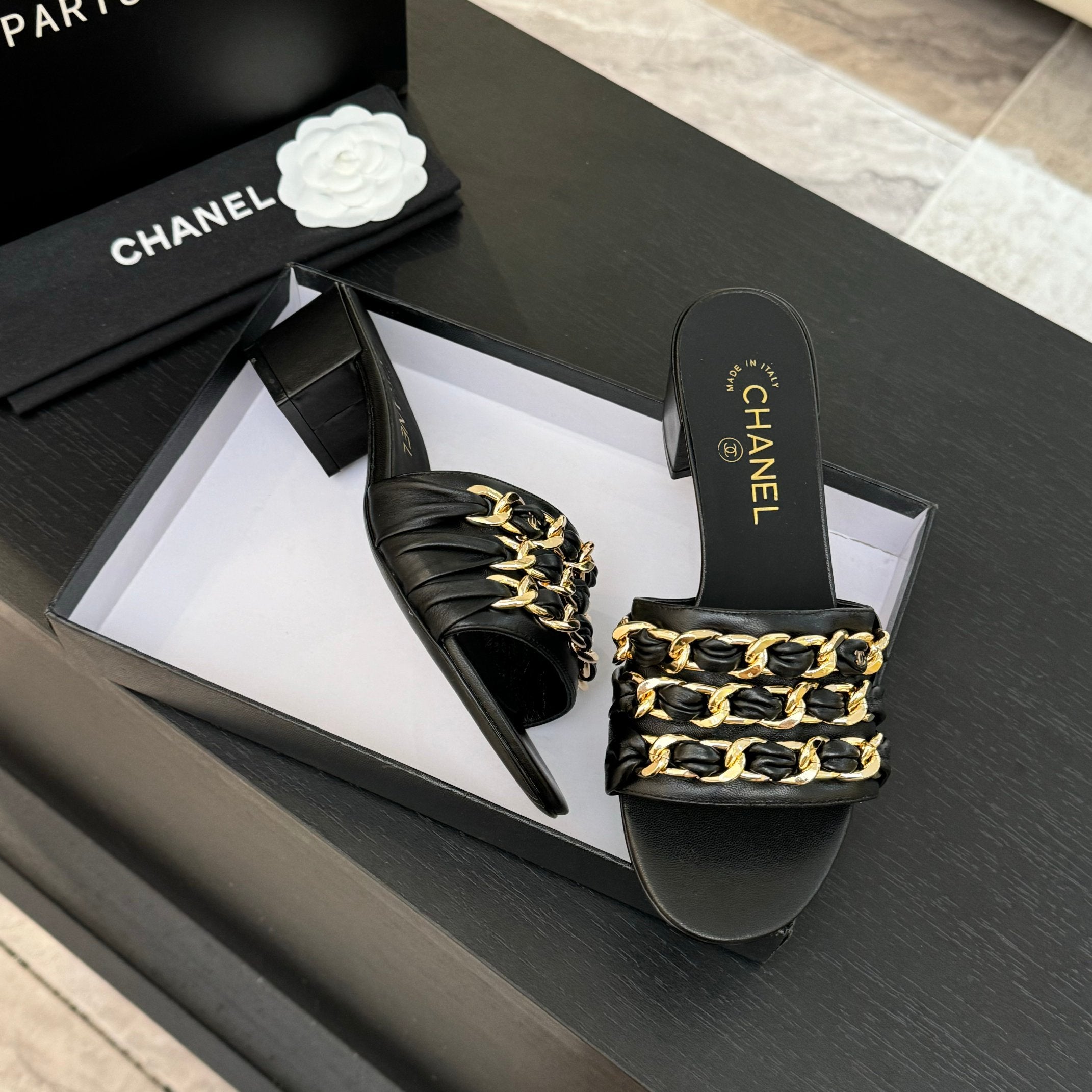 CC 25B Heel Mule Sandals 50mm Black Sheepskin With Chain 373819