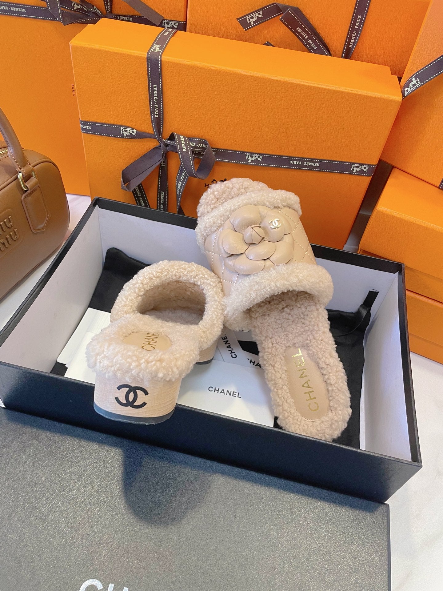 CC 25C Flower Slippers 50mm Beige Shearling Wood Sheepskin 423696