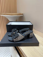 CC HIGH HEEL BLACK SATIN WITH WHITE RHINESTONES