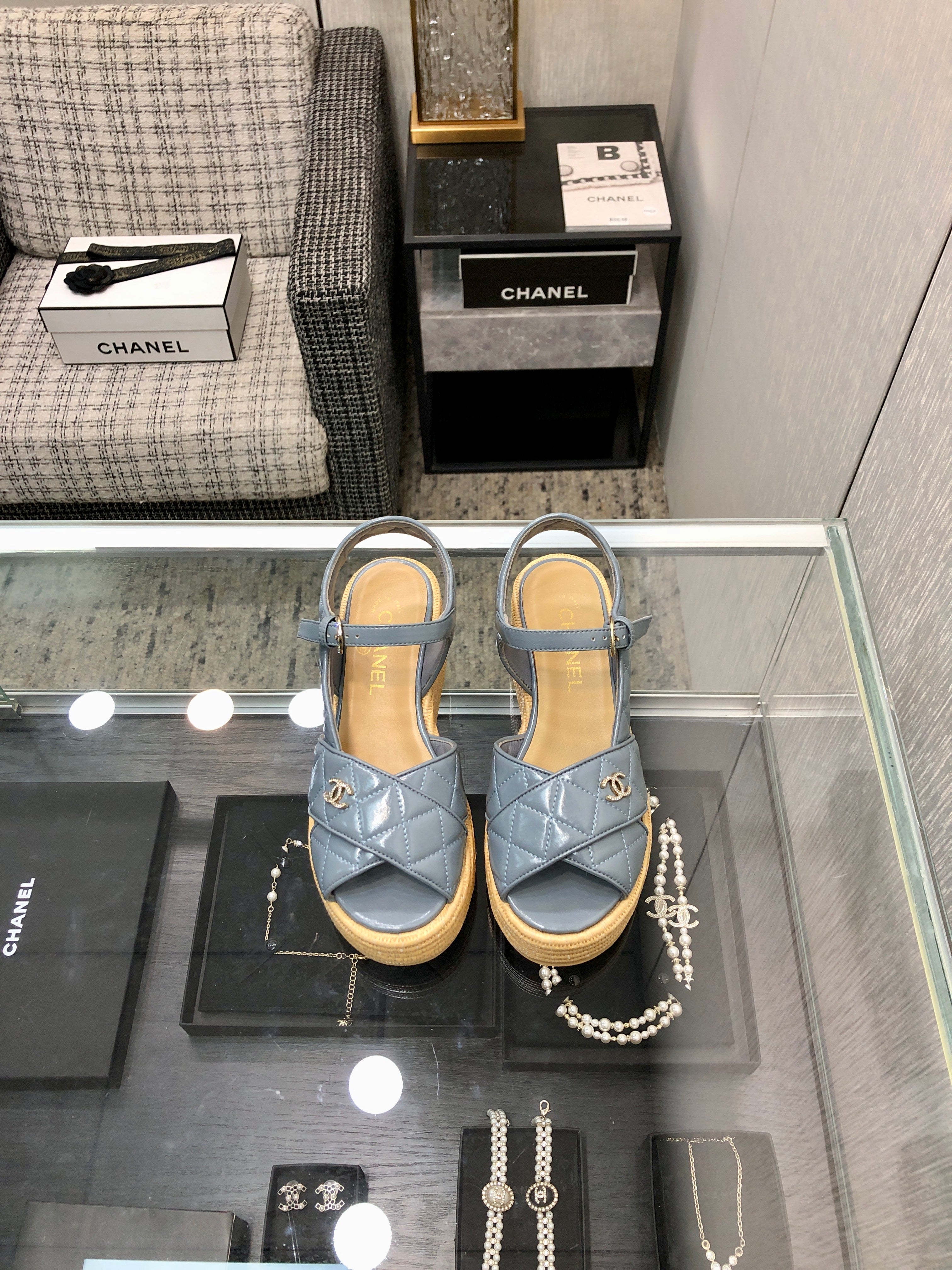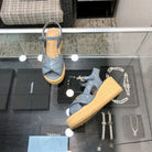 PEEP-TOE THICK SOLE SANDALS IN STONE BLUE PATENT LAMBSKIN
