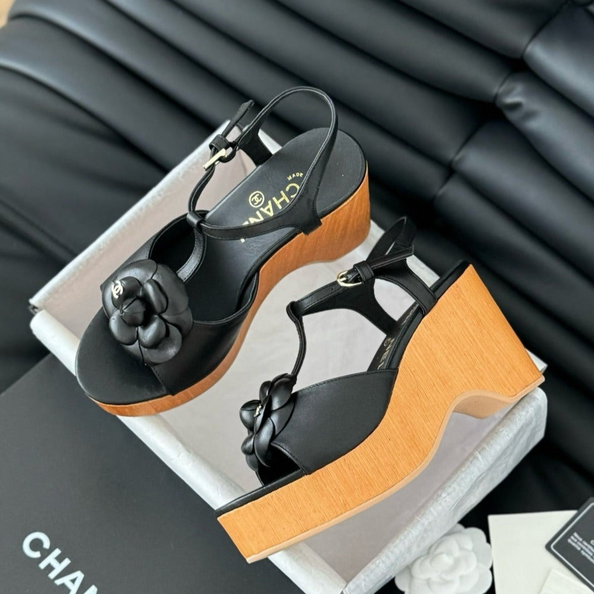 Double C Wood Grain Platform Slippers Black Sheepskin