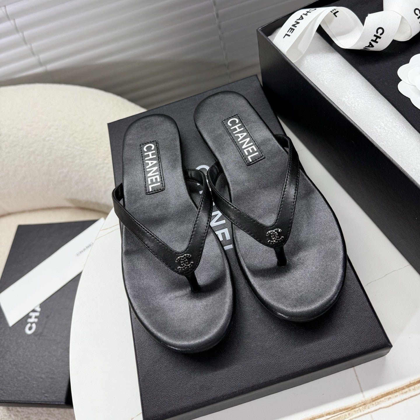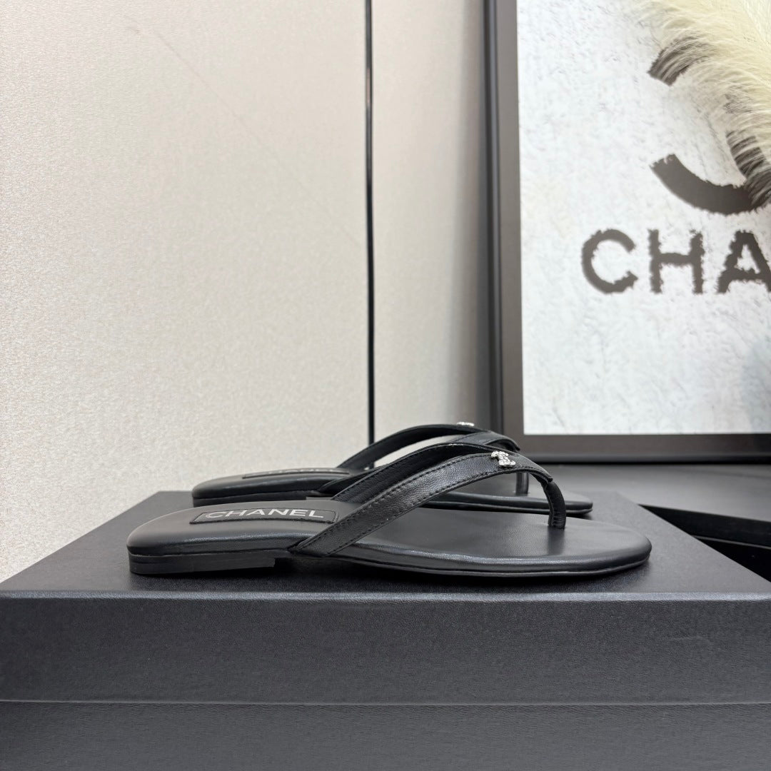 CC 25SS Thong Sandals Double C Rhinestone Black Sheepskin 352435