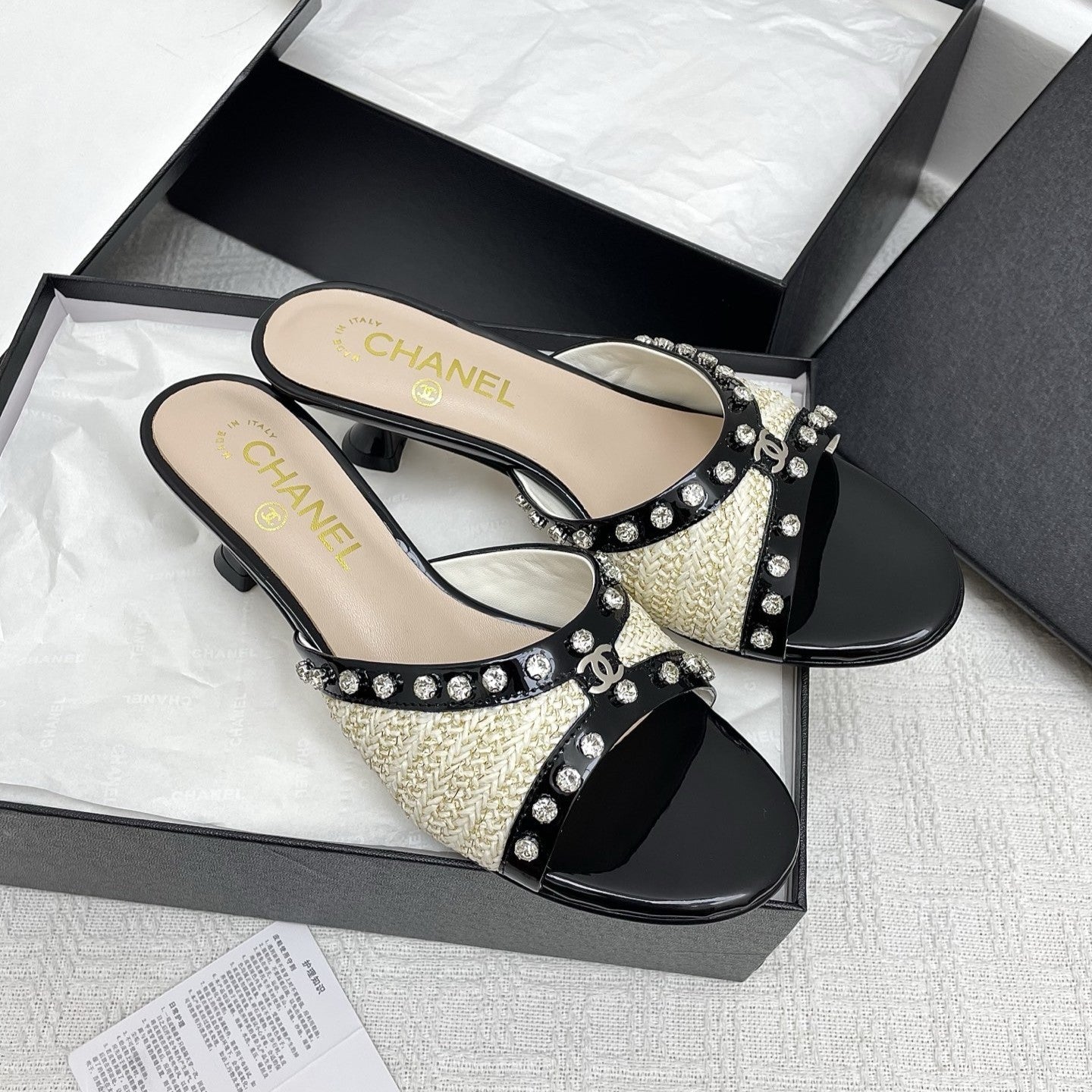 CC 25SS Slippers 5cm Light Yellow Raffia Black Patent Calfskin 338299