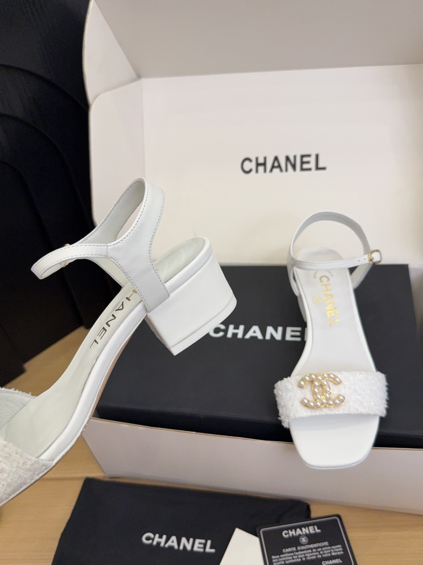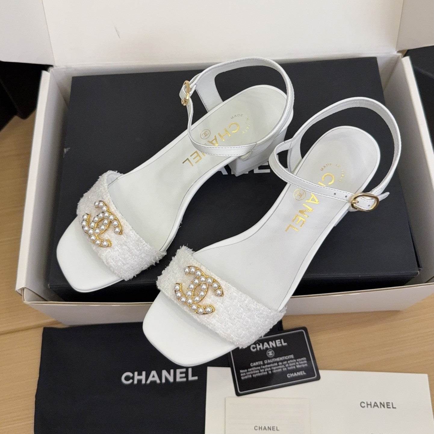 CC 25 Logo With Pearl High Heels 40 Sandals White Tweed And Sheepskin Square Toe 277710