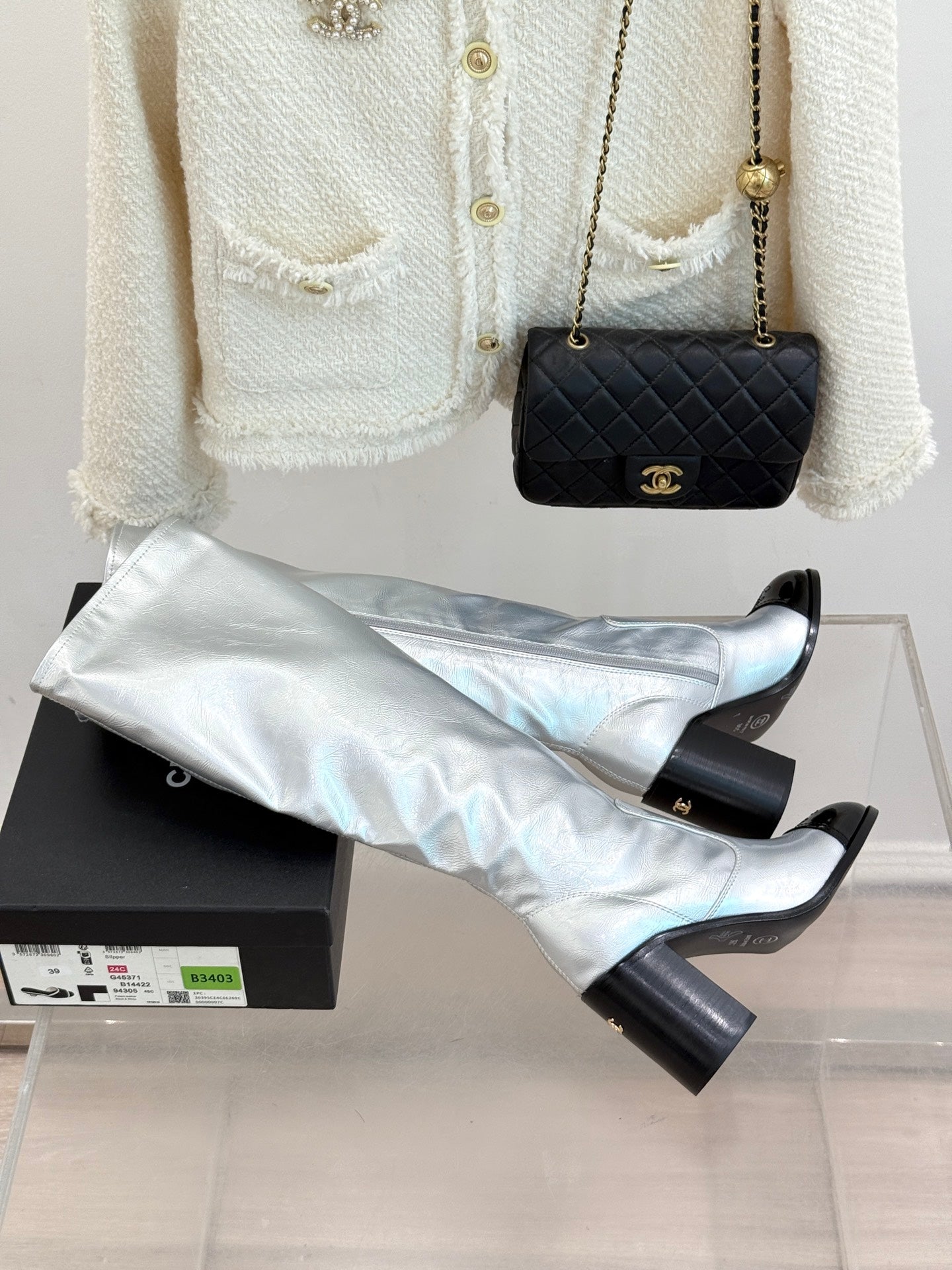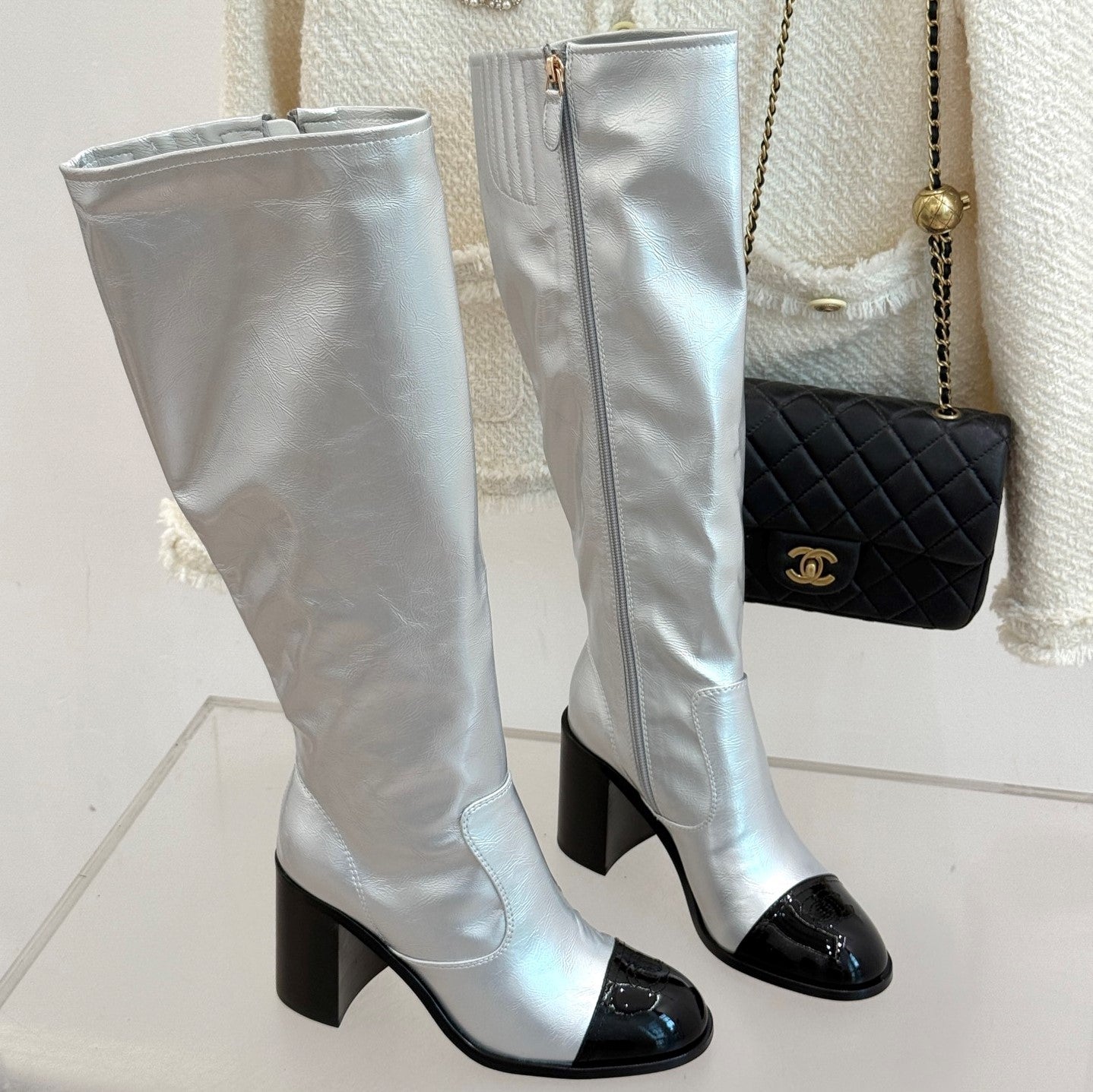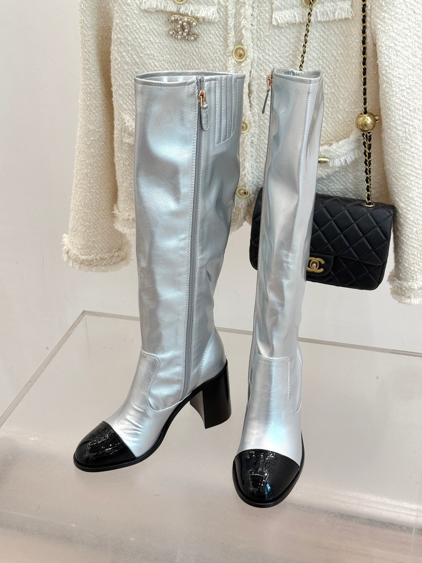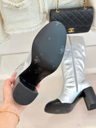 CC Classic Long Boots Block Heel 90mm Sliver Metalic Calfskin 465392