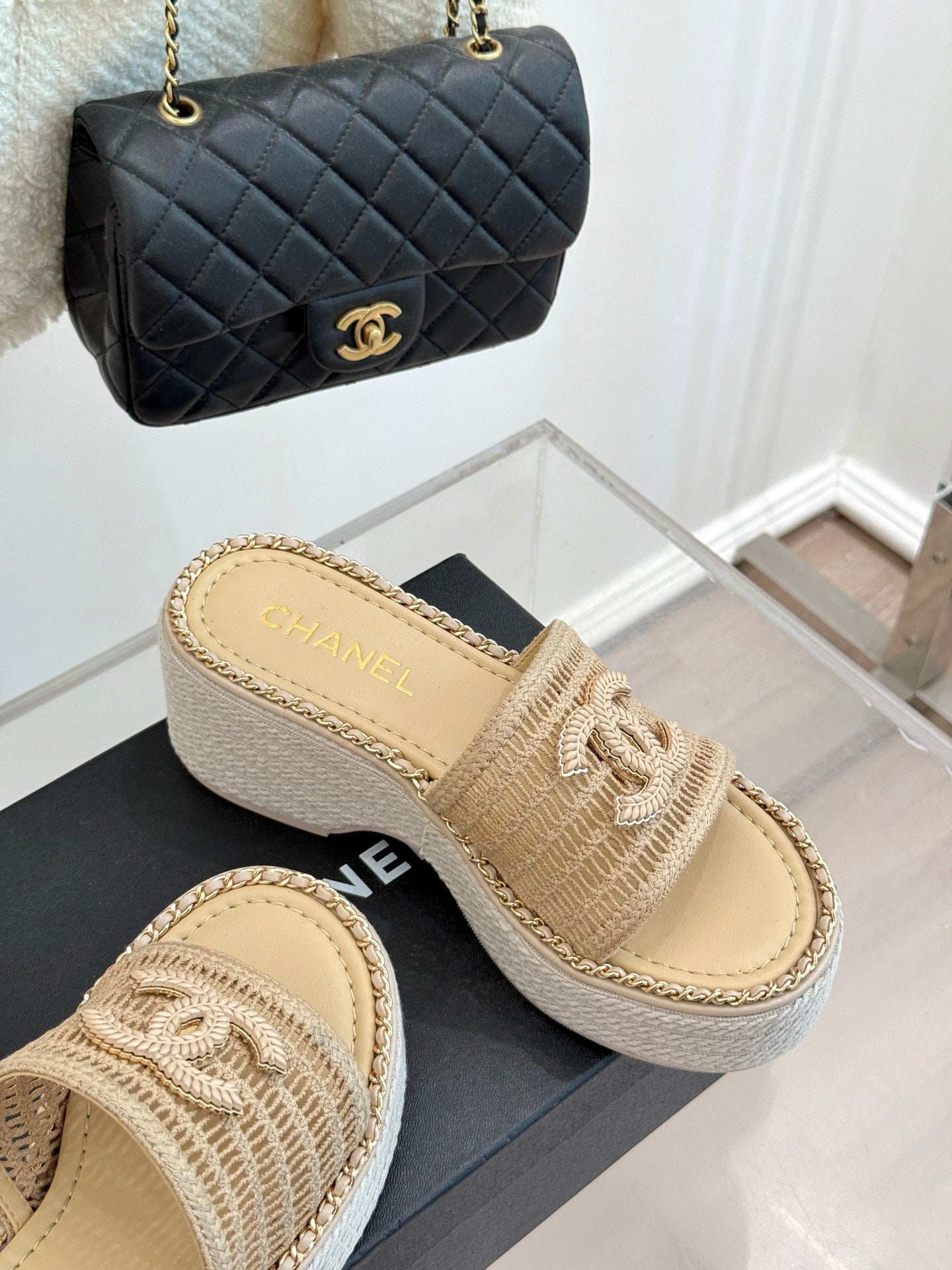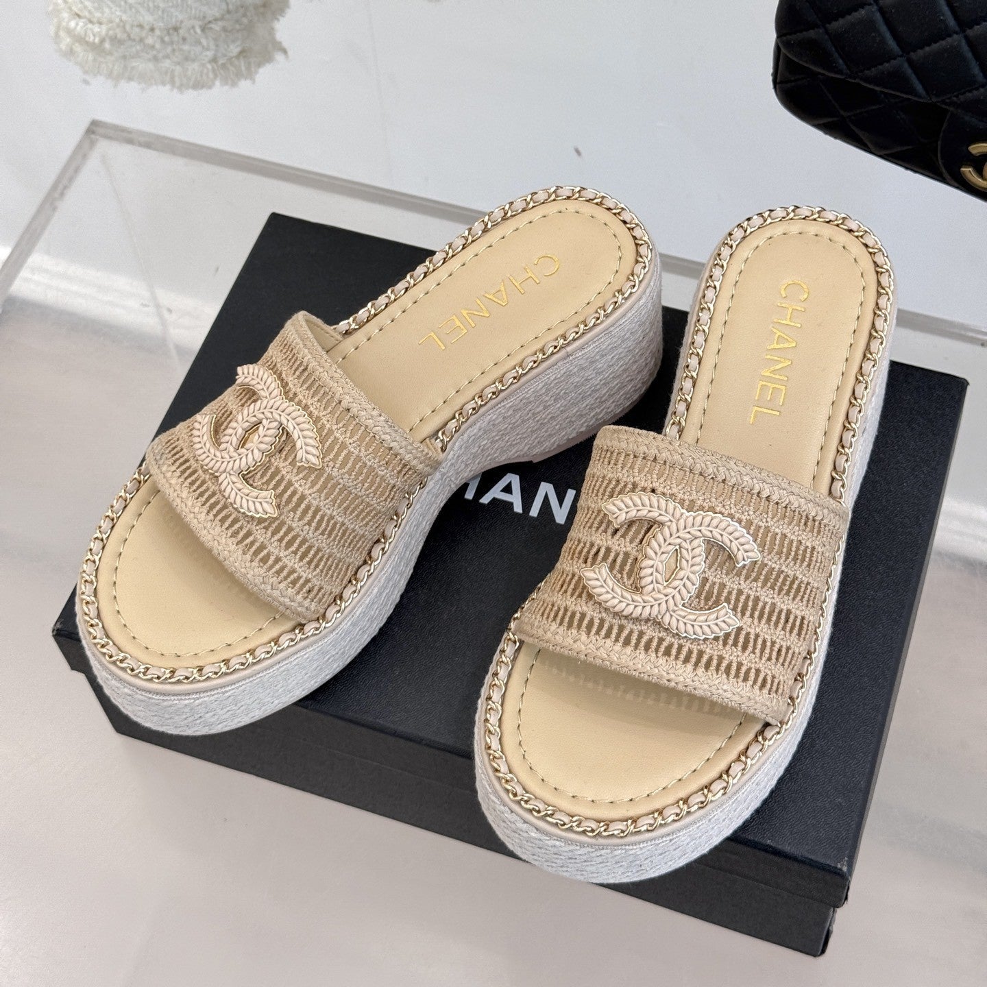 CC Mesh Hollow Chain Double C Thick-Soled Slippers 70mm Beige 265649