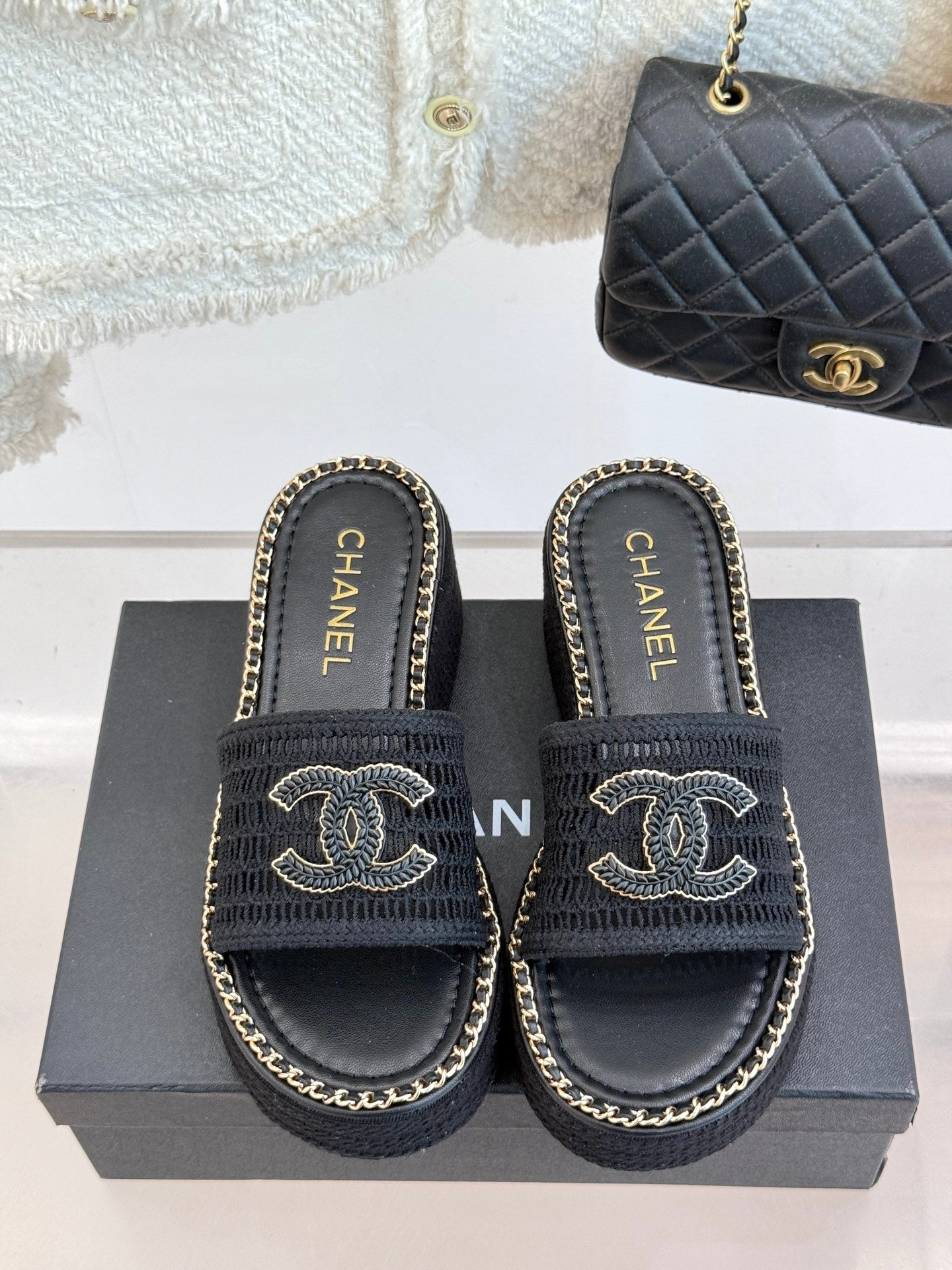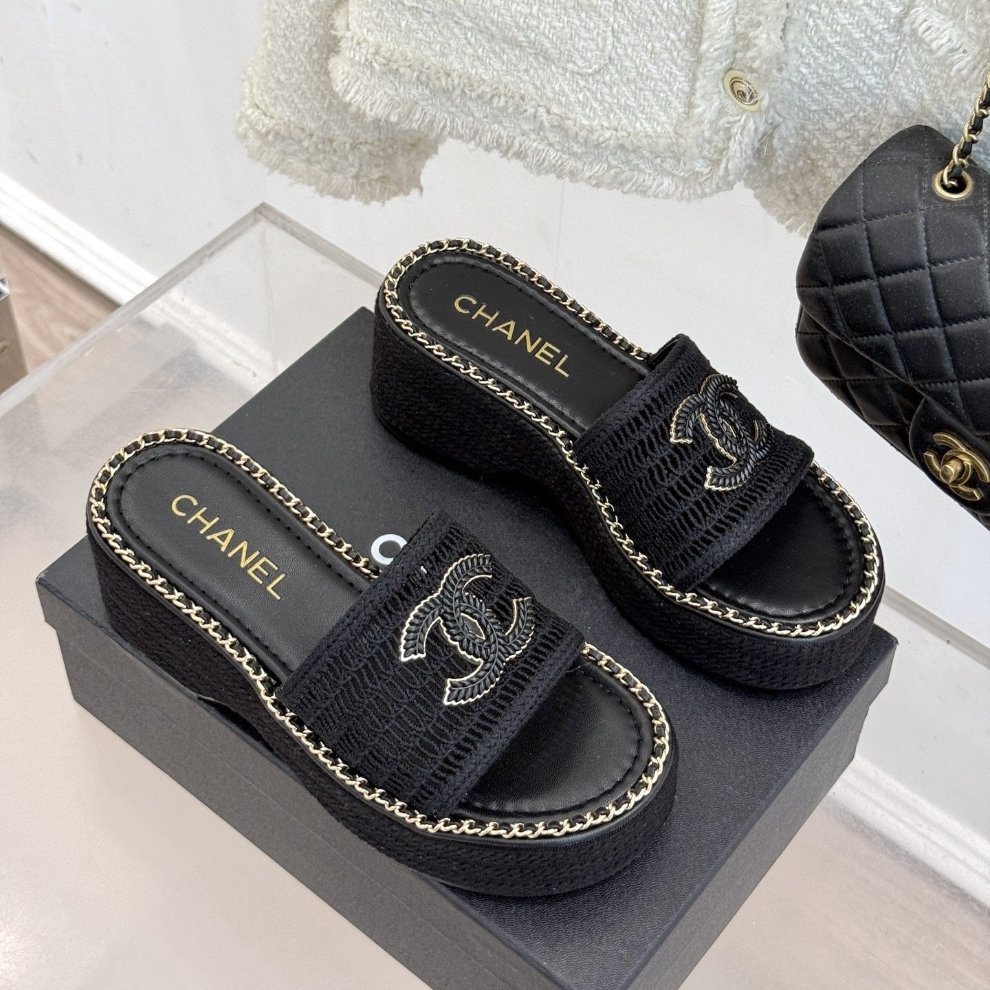 CC Mesh Hollow Chain Double C Thick-Soled Slippers 70mm Black 265651