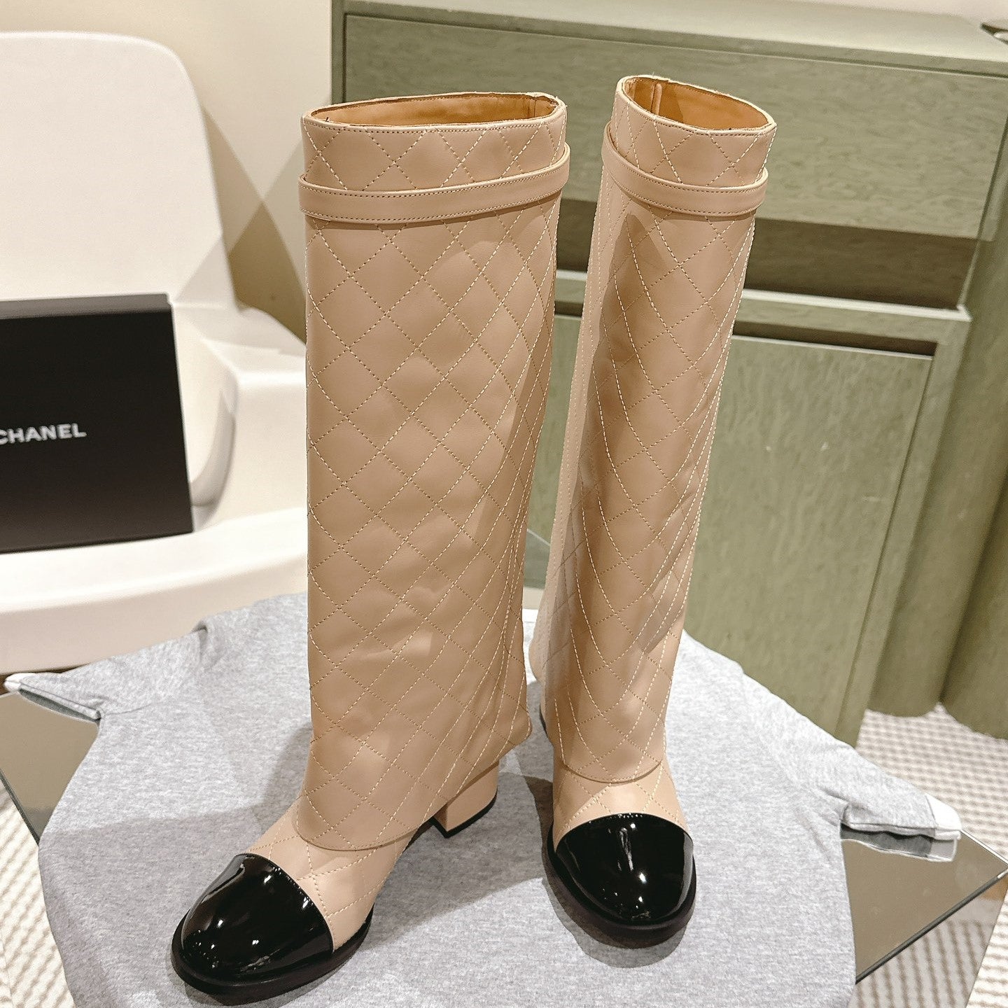 CC 24ss Fold-Over High Boots 40mm Beige Quilted Sheepskin 447475