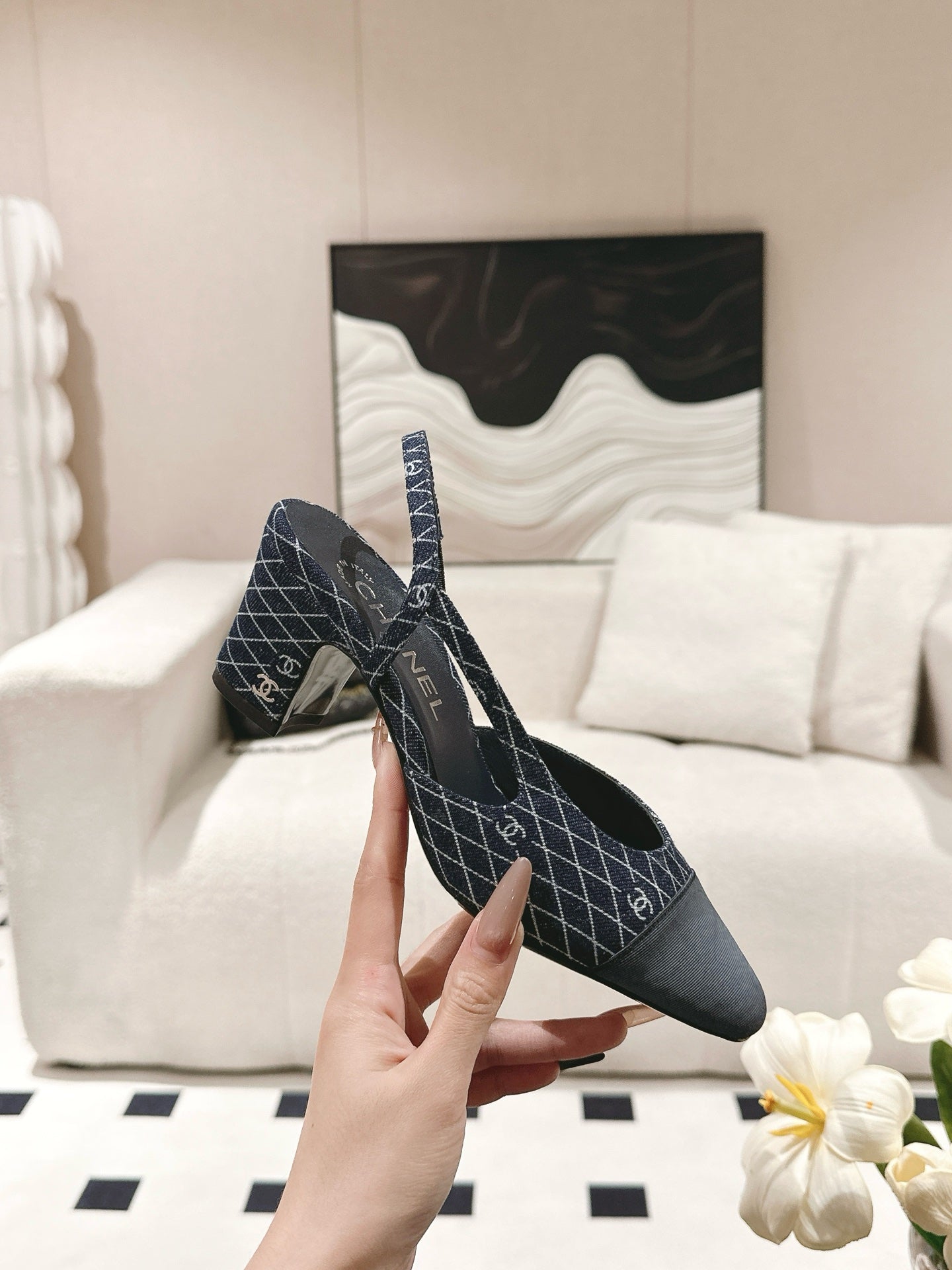 cc 25c slingback 55mm cross line pattern dark blue denim 237488