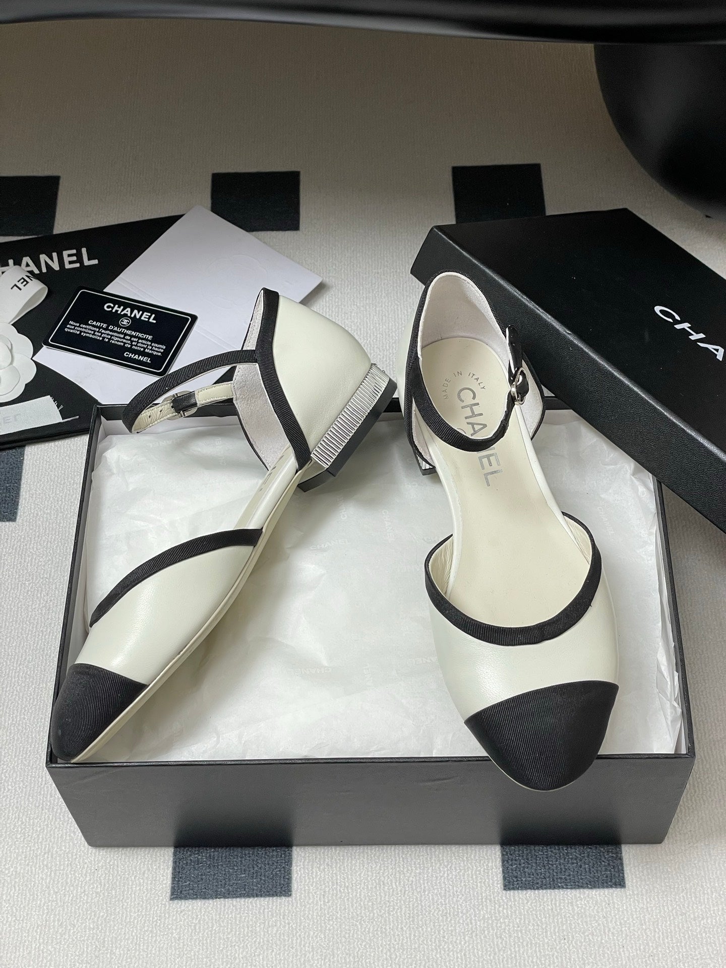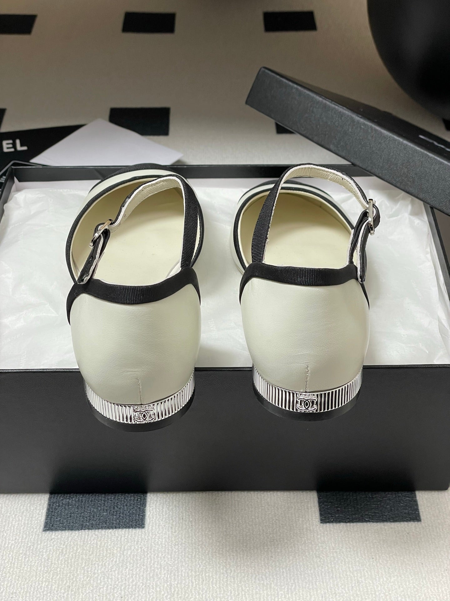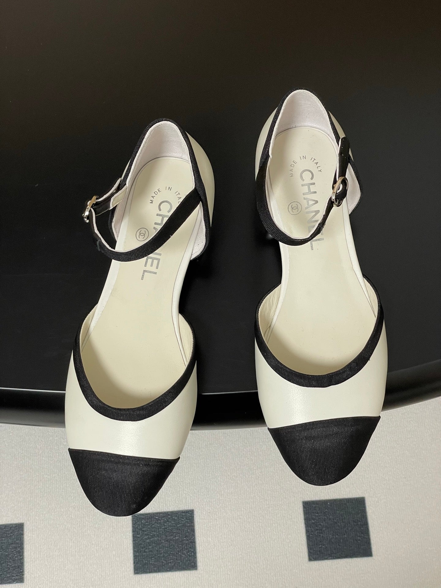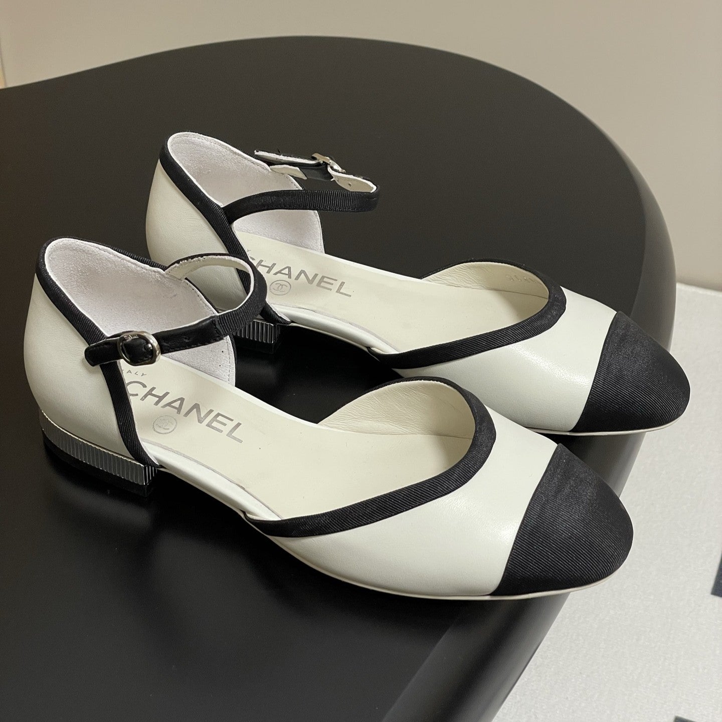 CC 25P Small Hollow Mary Jane White Sheepskin Black Grosgrain 247726