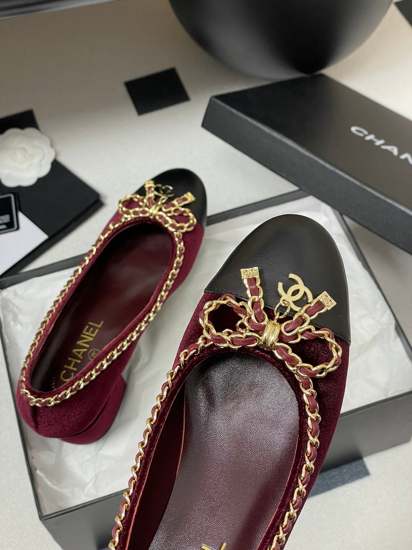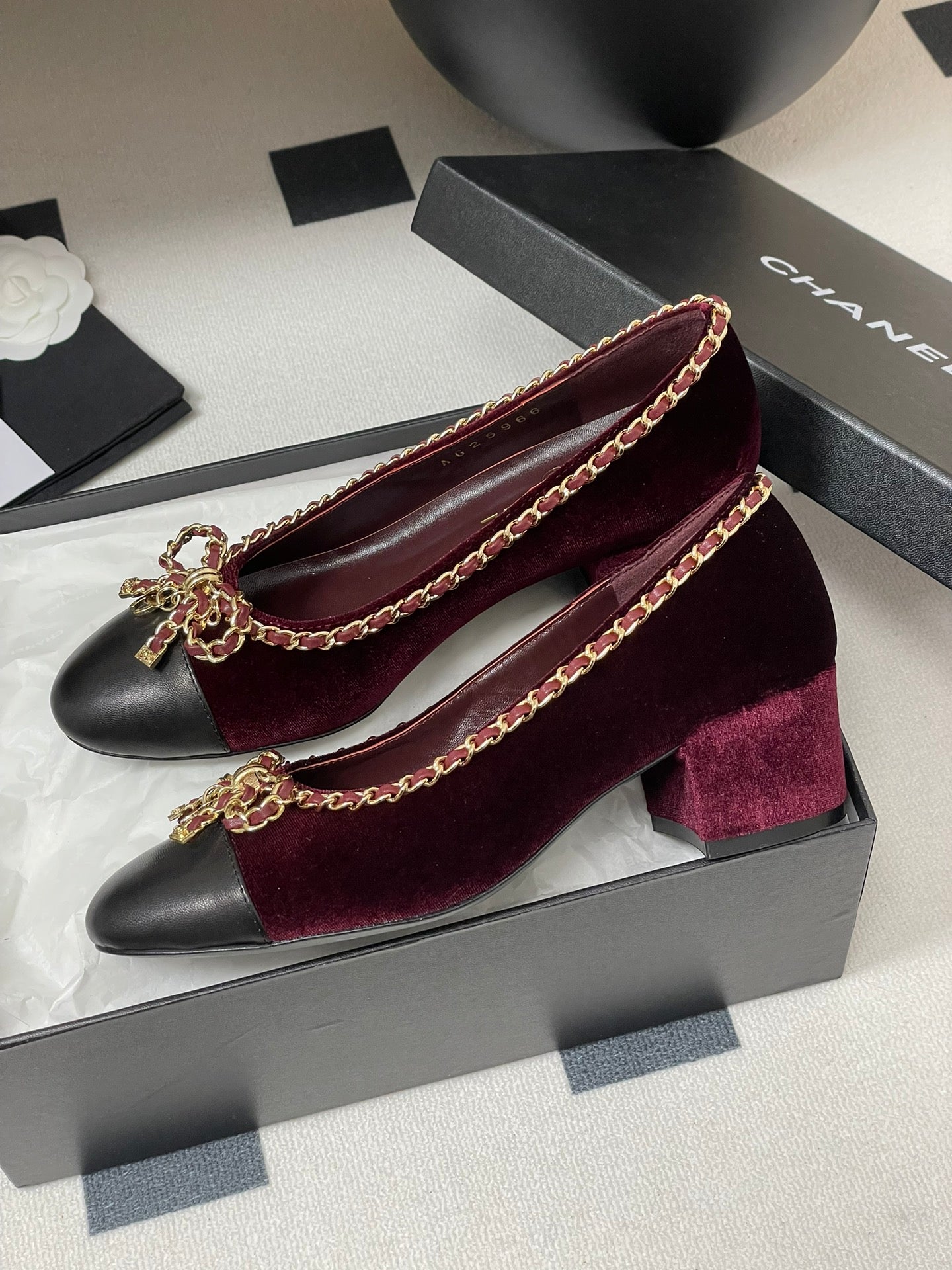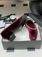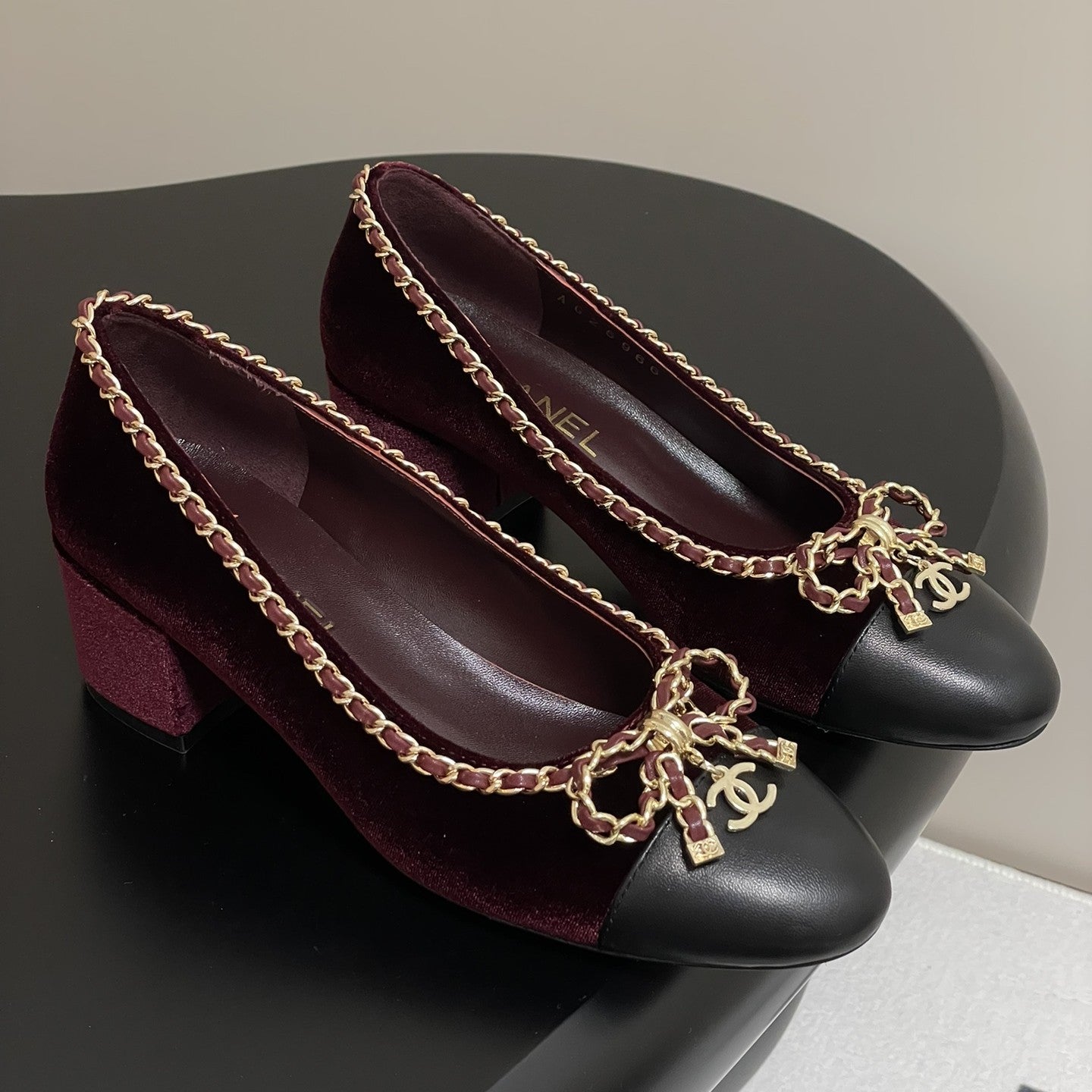 CC 25S 60mm Chain Bow Single Pumps Burgundy Velvet Black Sheepskin 247661