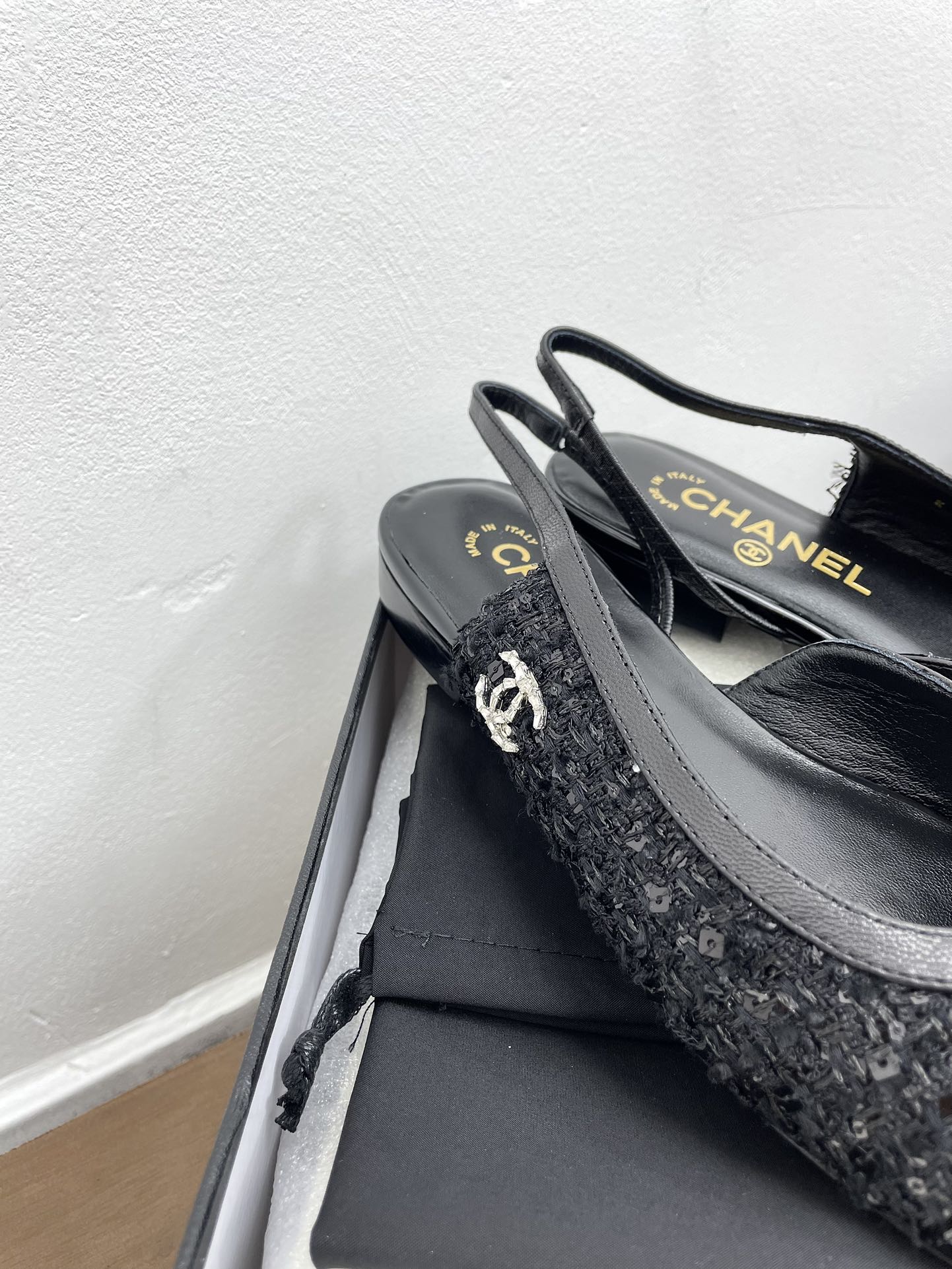 CC Slingback Black Tweed Fabric And Calfskin