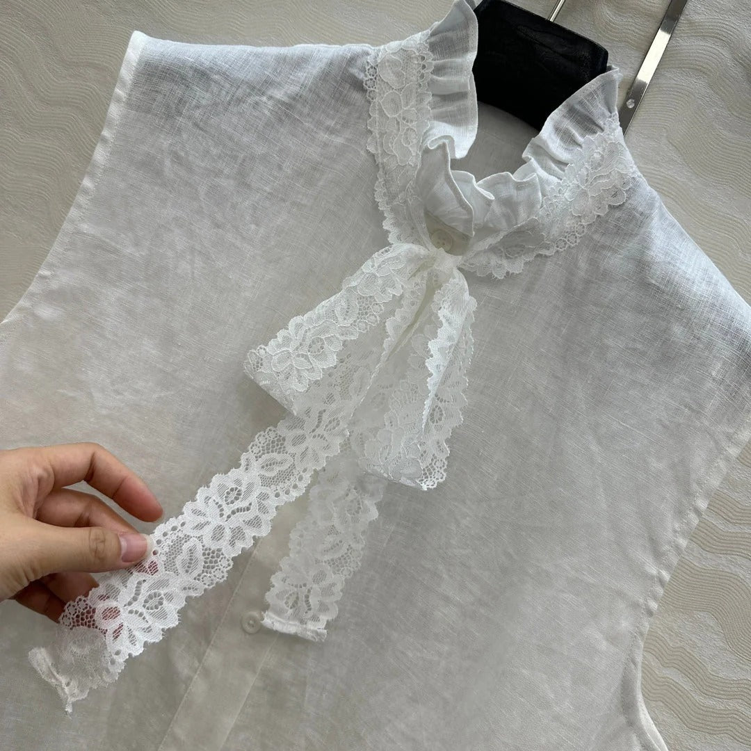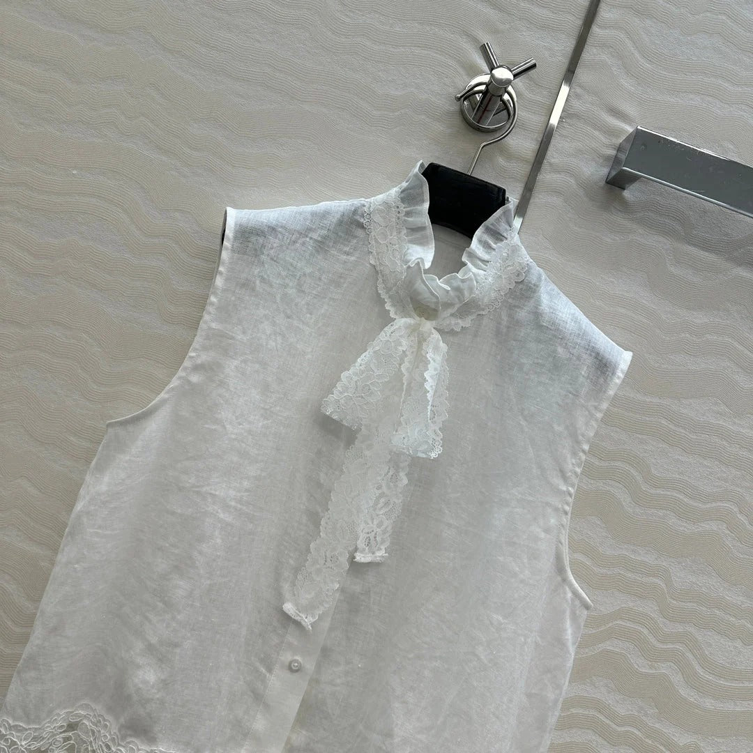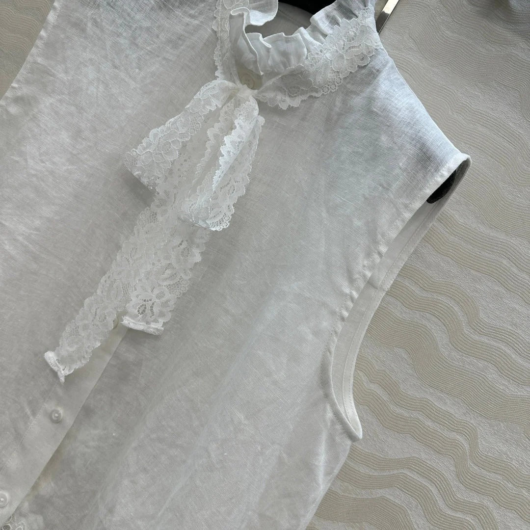 SLEEVELESS BLOUSE IN WHITE LINEN LACE TRIM AND NECK TIE