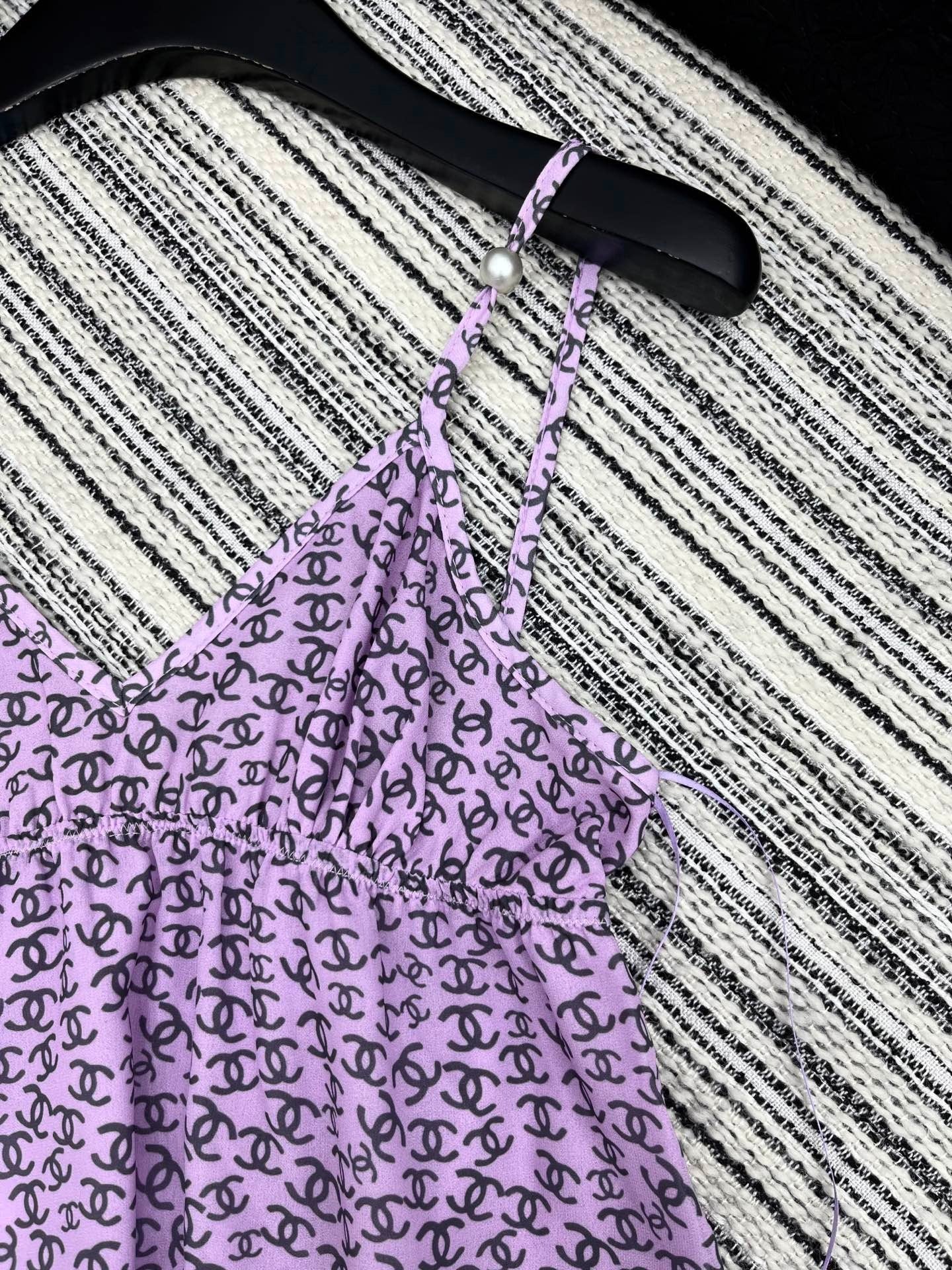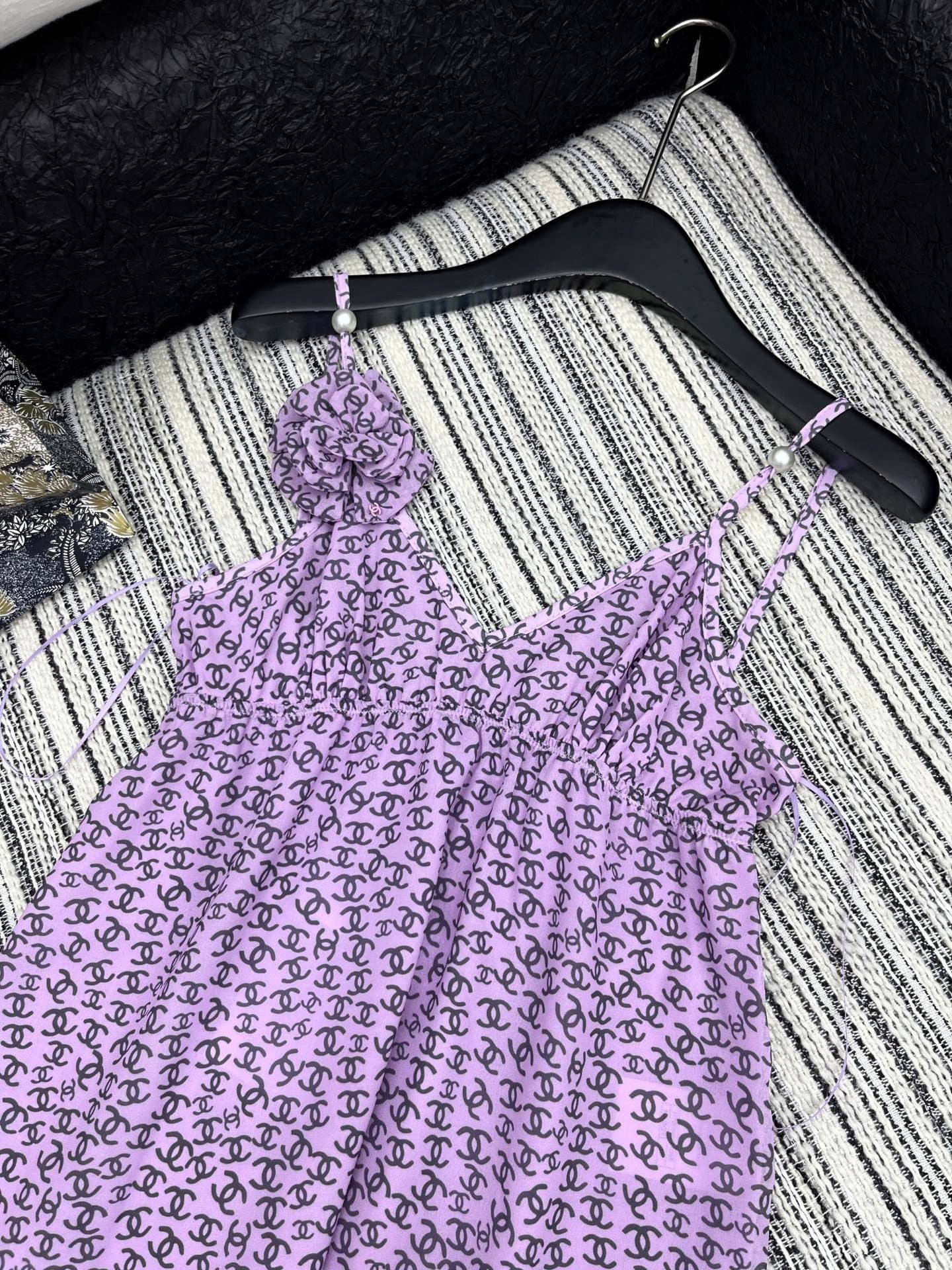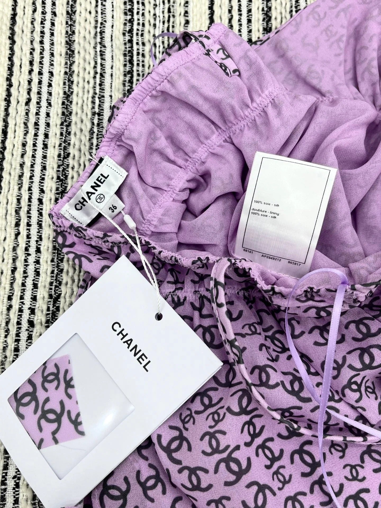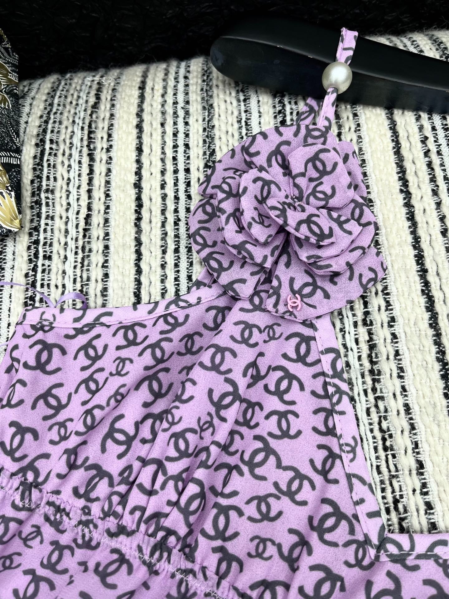 CHANEL PURPLE SILK CAMELLIA DRESS WITH PEARL DETAILS