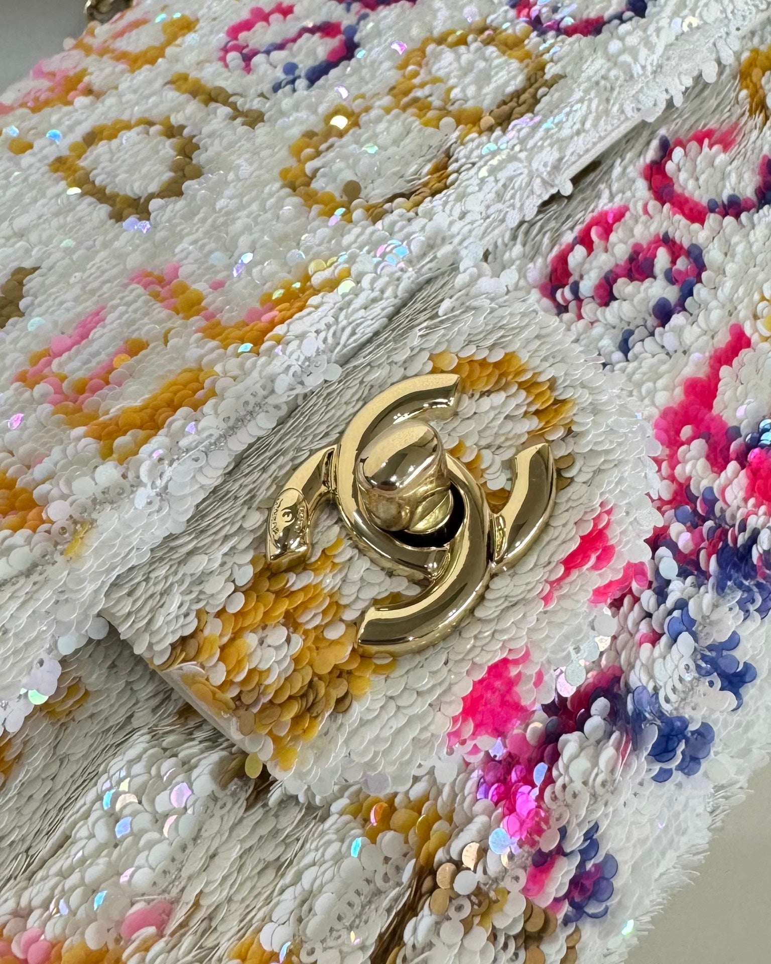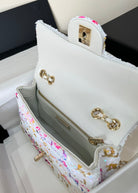 FLAP BAG 20 COLORFUL SAQUINS IN WHITE CALFSKIN GOLD HARDWARE