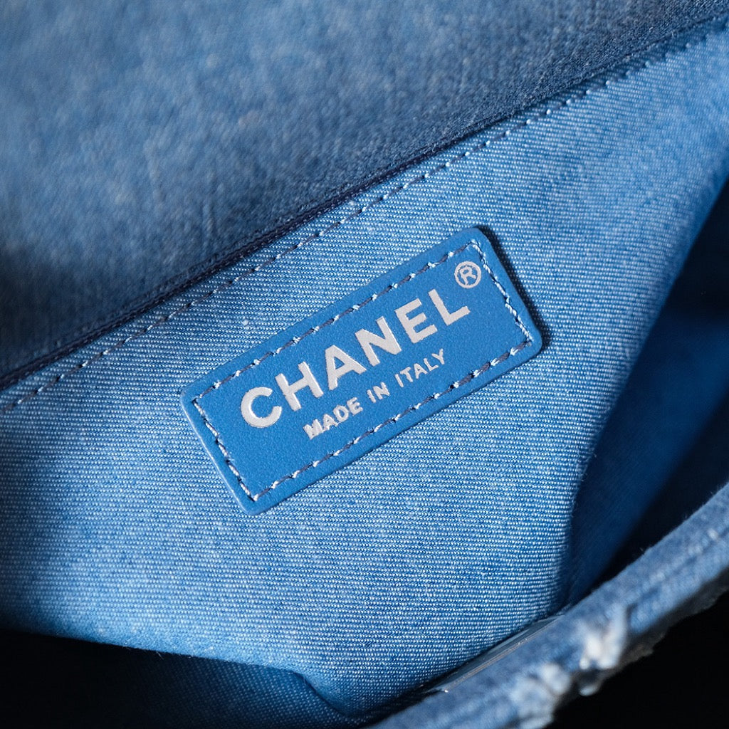 MEDIUM FLAP BAG 25 IN CLASSIC BLUE DENIM GOLD HARDWARE
