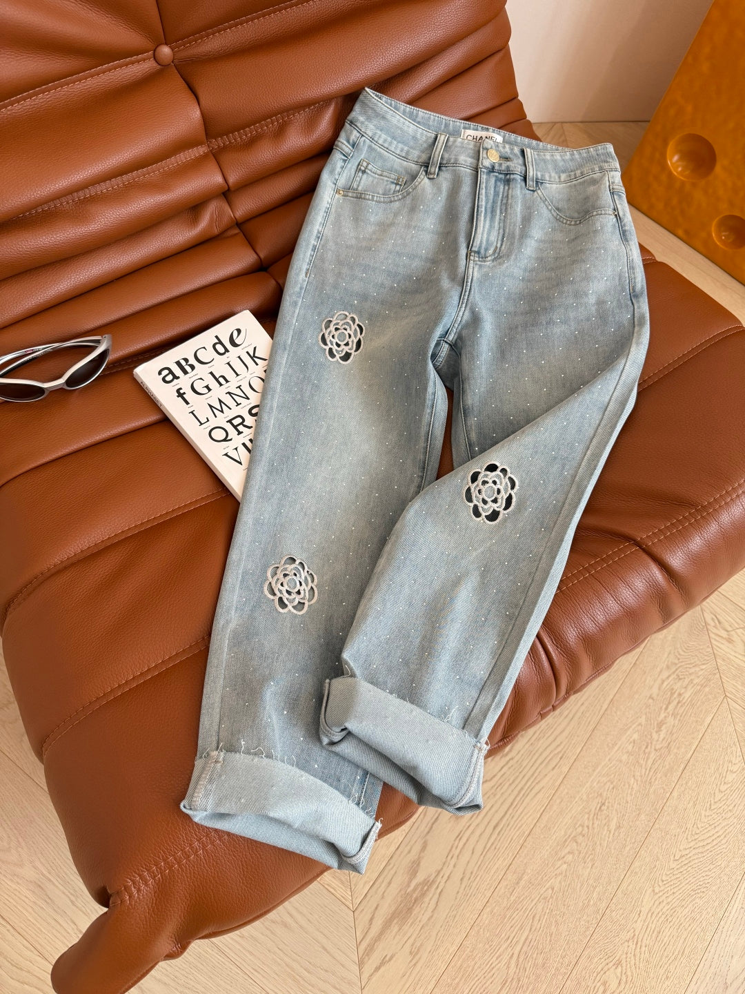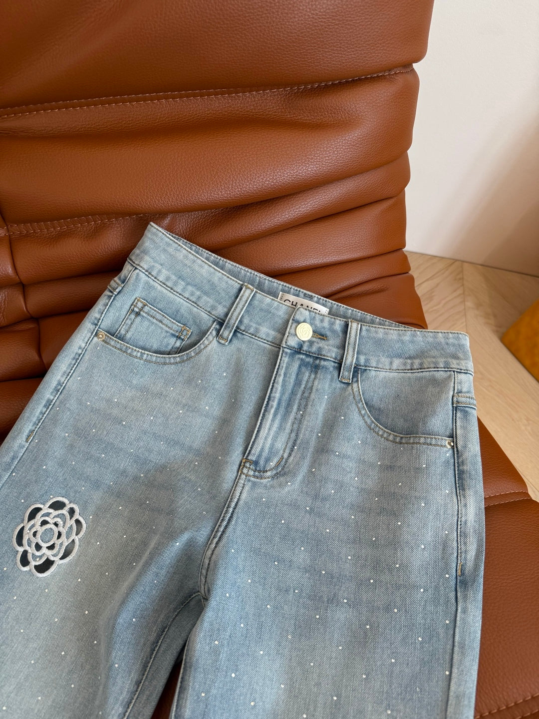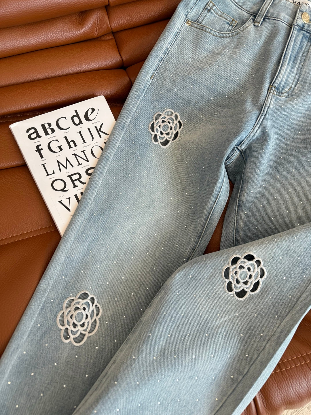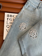 CC 25 Hollow Camellia Embroidery Jeans Light Blue Denim Cotton